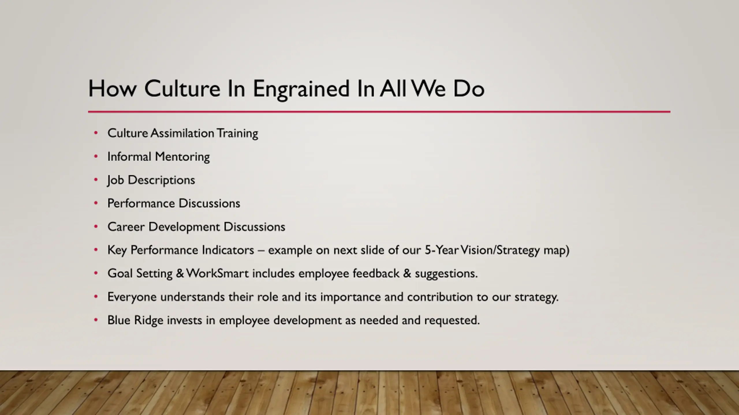 How Culture In Engrained In All We Do Culture Assimilation Training Informal Mentoring Job Descriptions Performance Discussions Career Development Discussions Key Performance Indicators example on next slide of our 5-Year Vision/Strategy map) Goal Setting & WorkSmart includes employee feedback & suggestions. Everyone understands their role and its importance and contribution to our strategy. Blue Ridge invests in employee development as needed and requested.