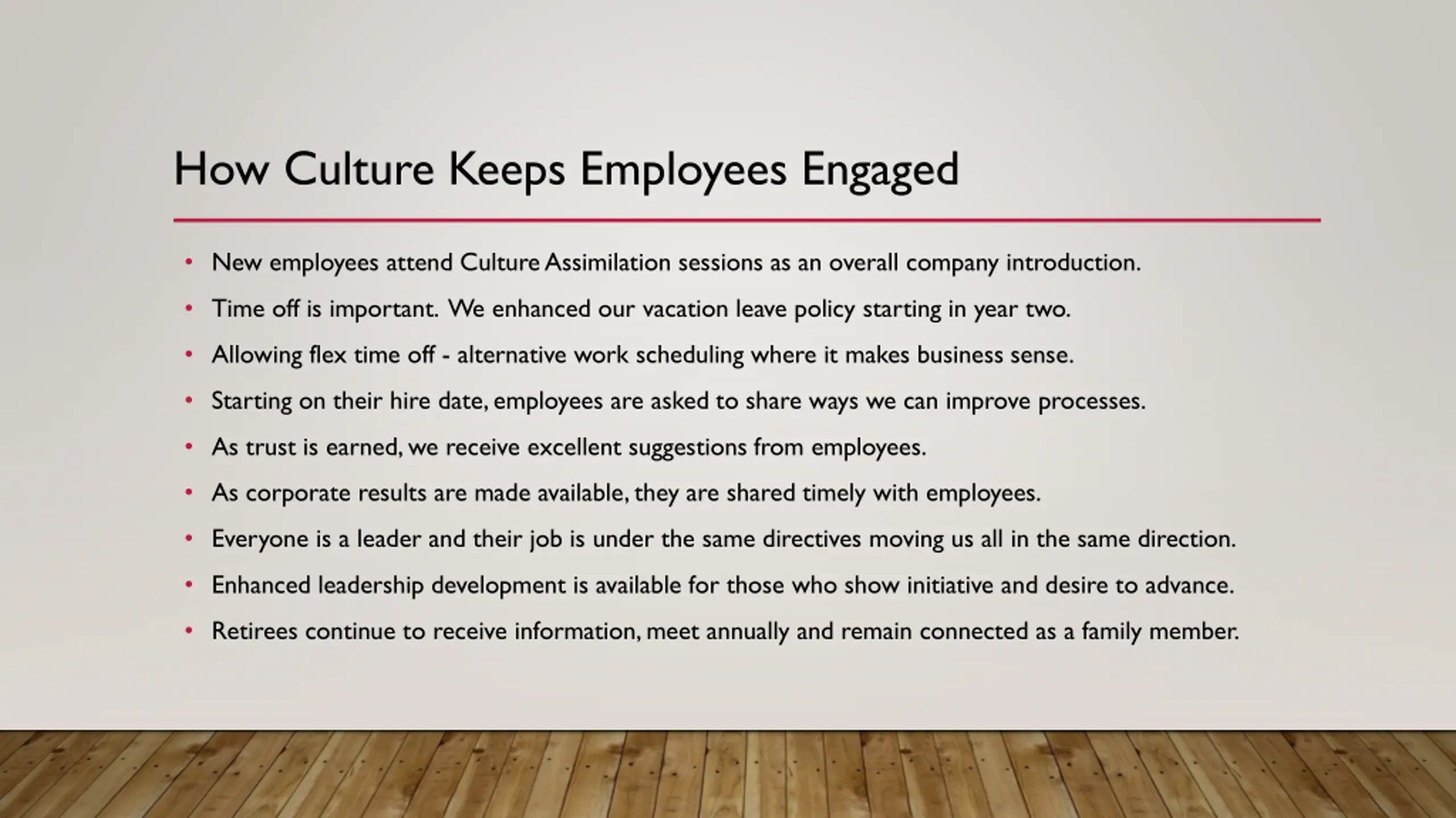 How Culture Keeps Employees Engaged New employees attend Culture Assimilation sessions as an overall company introduction. Time off is important. We enhanced our vacation leave policy starting in year two. Allowing flex time off - alternative work scheduling where it makes business sense. Starting on their hire date, employees are asked to share ways we can improve processes. As trust is earned, we receive excellent suggestions from employees. As corporate results are made available, they are shared timely with employees. Everyone is a leader and their job is under the same directives moving us all in the same direction. Enhanced leadership development is available for those who show initiative and desire to advance. Retirees continue to receive information, meet annually and remain connected as a family member.
