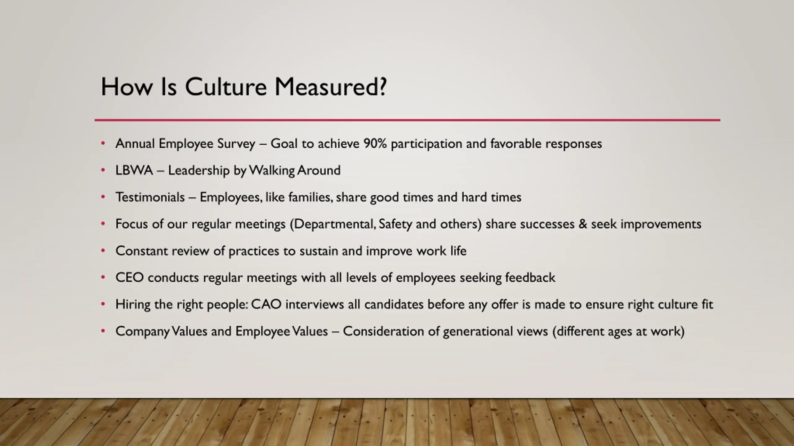 How Is Culture Measured? Annual Employee Survey Goal to achieve 90% participation and favorable responses LBWA Leadership by Walking Around Testimonials Employees, like families, share good times and hard times Focus of our regular meetings (Departmental, Safety and others) share successes & seek improvements Constant review of practices to sustain and improve work life CEO conducts regular meetings with all levels of employees seeking feedback Hiring the right people: CAO interviews all candidates before any offer is made to ensure right culture fit Company Values and Employee Values Consideration of generational views (different ages at work)