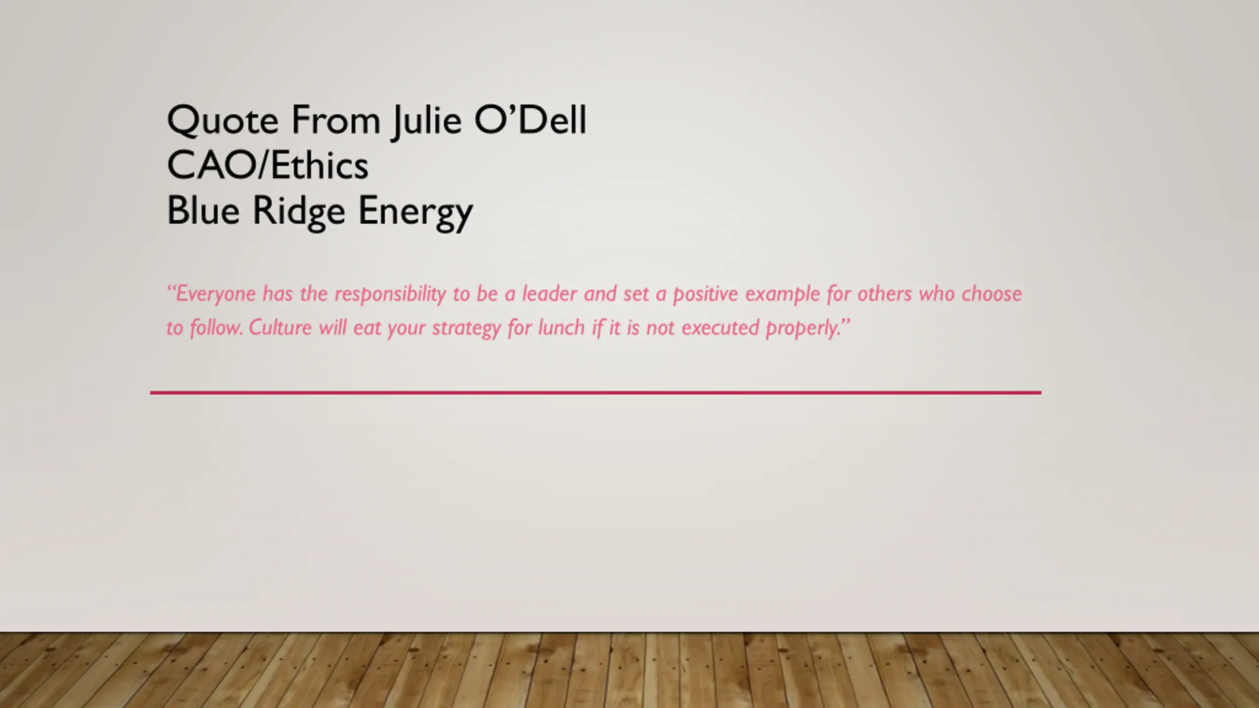 Quote From Julie ODell CAO/Ethics Blue Ridge Energy Everyone has the responsibility to be a leader and set a positive example for others who choose to follow. Culture will eat your strategy for lunch if it is not executed properly.