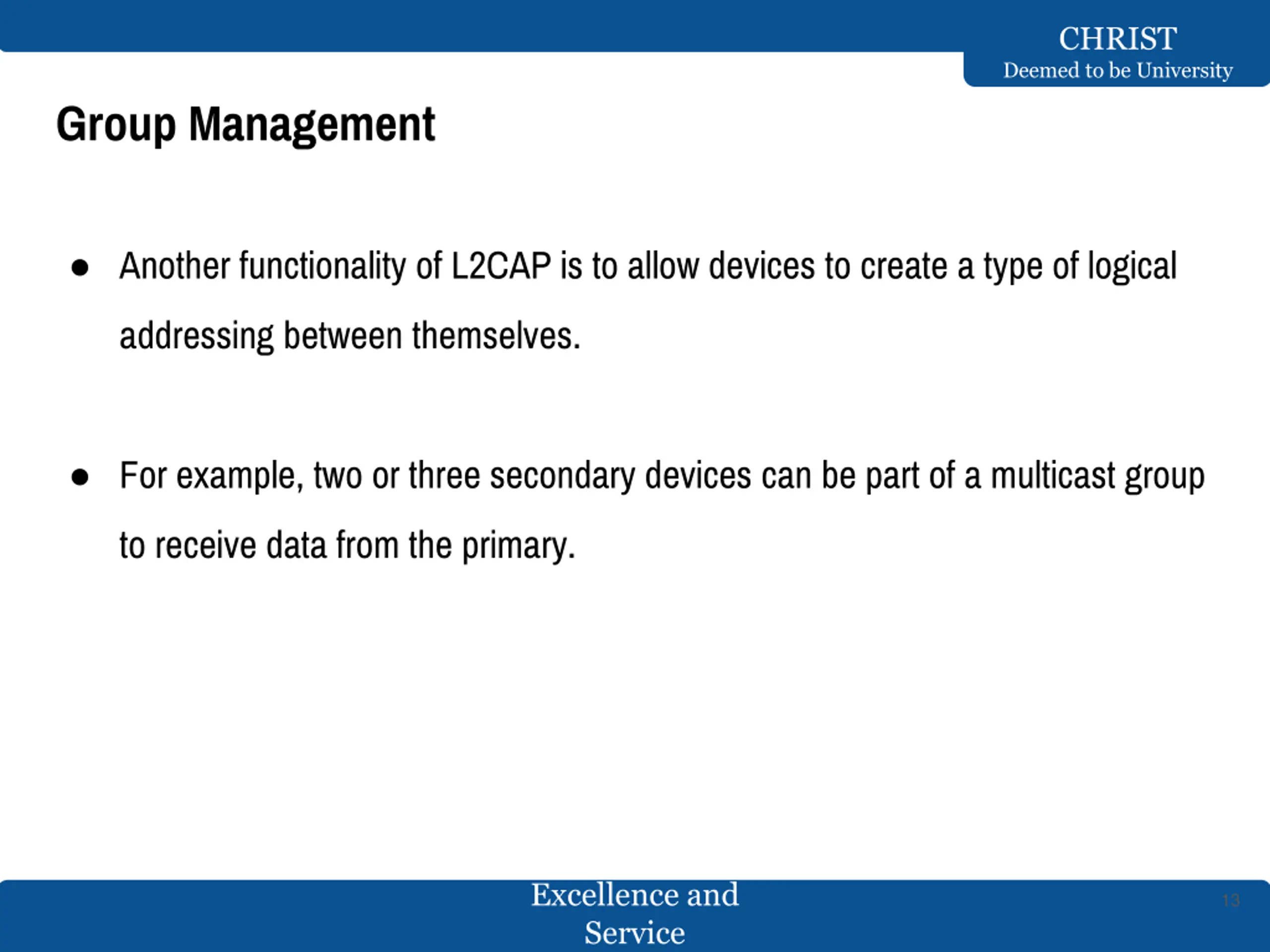 CHRIST Deemed to be University Group Management Another functionality of L2CAP is to allow devices to create a type of logical addressing between themselves. For example, two or three secondary devices can be part of a multicast group to receive data from the primary. Excellence and Service 13