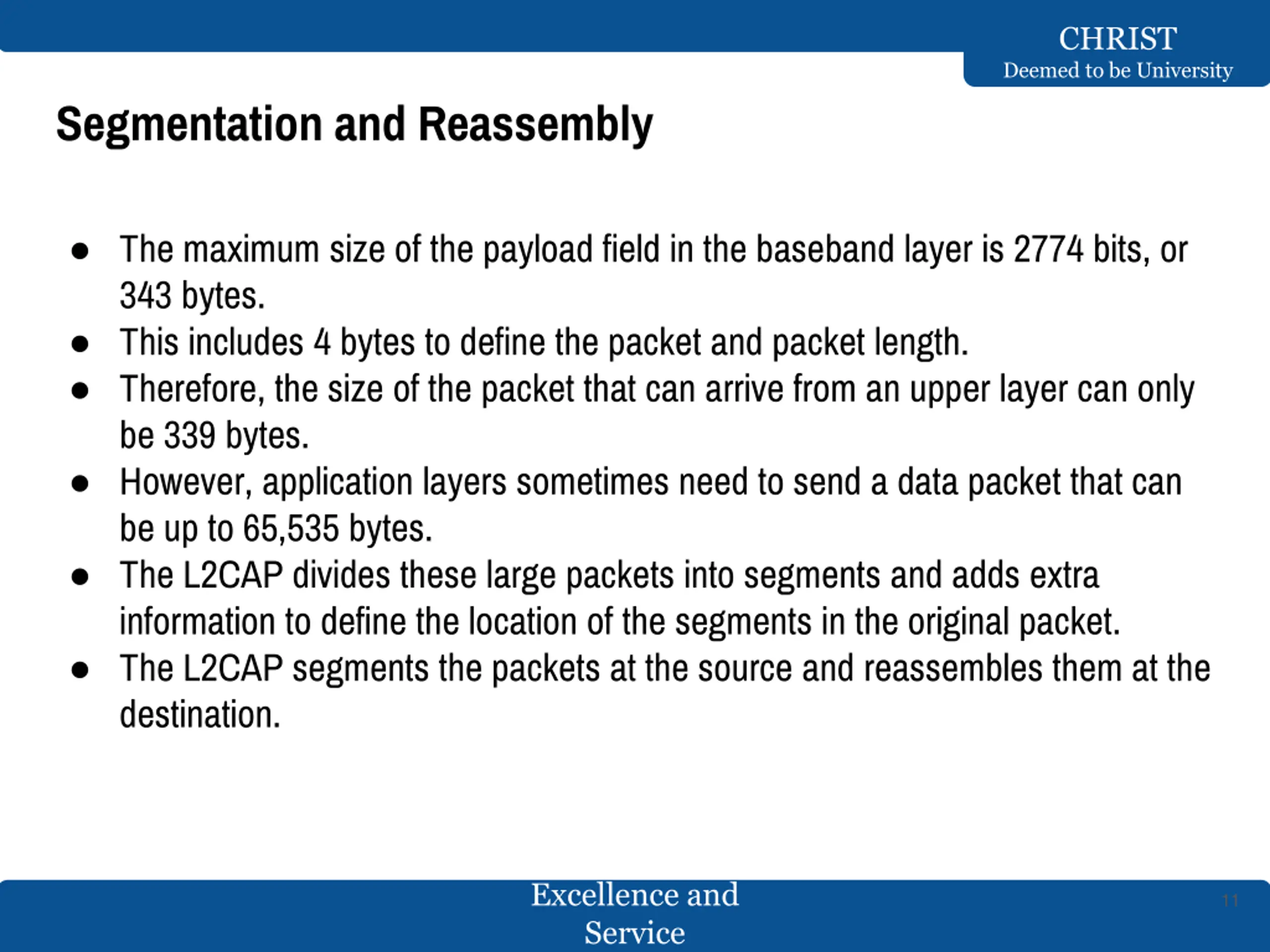 CHRIST Deemed to be University Segmentation and Reassembly The maximum size of the payload field in the baseband layer is 2774 bits, or 343 bytes. This includes 4 bytes to define the packet and packet length. Therefore, the size of the packet that can arrive from an upper layer can only be 339 bytes. However, application layers sometimes need to send a data packet that can be up to 65,535 bytes. The L2CAP divides these large packets into segments and adds extra information to define the location of the segments in the original packet. The L2CAP segments the packets at the source and reassembles them at the destination. Excellence and Service 11
