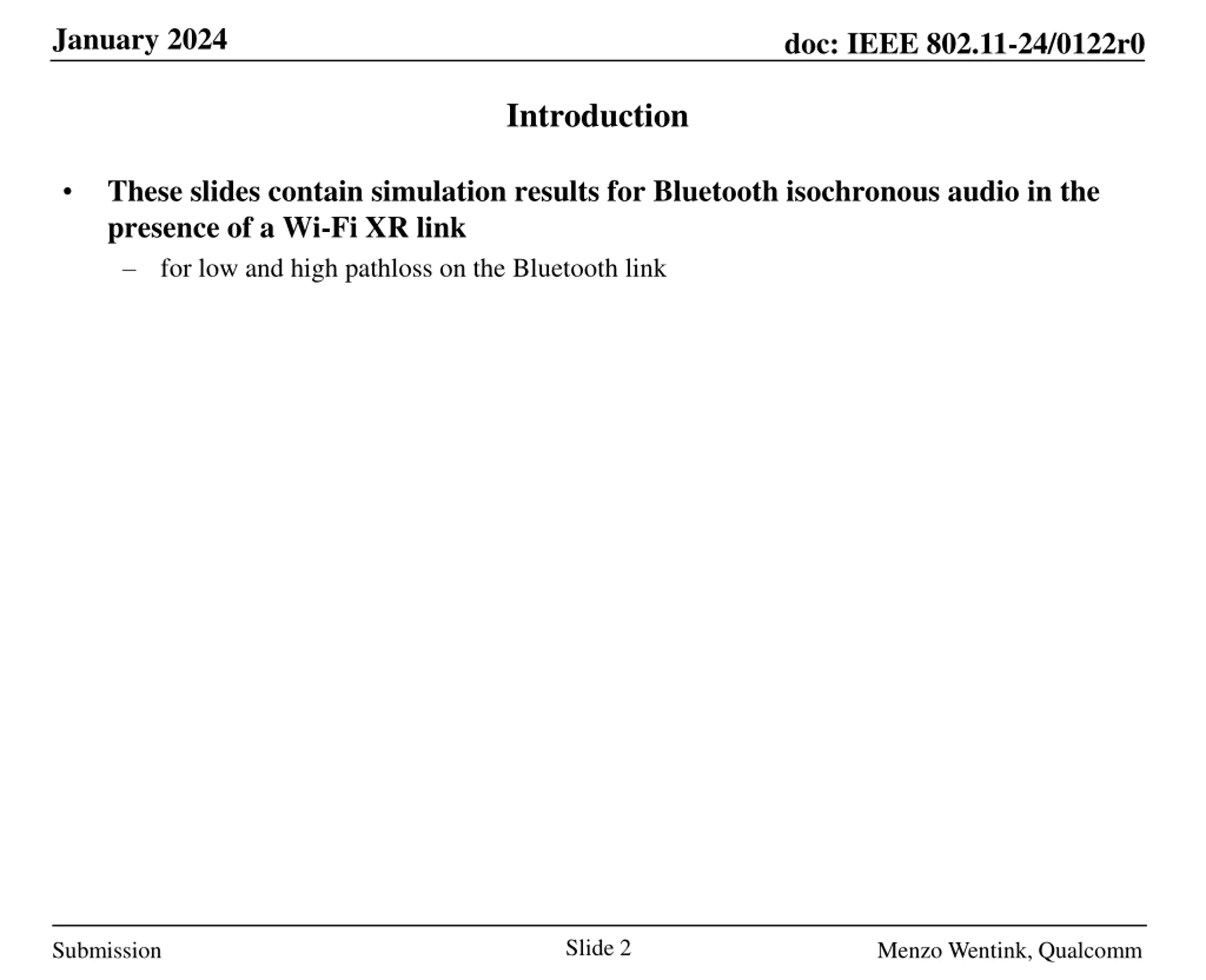 January 2024 doc: IEEE 802.11-24/0122r0 Introduction These slides contain simulation results for Bluetooth isochronous audio in the presence of a Wi-Fi XR link for low and high pathloss on the Bluetooth link Slide 2 Submission Menzo Wentink, Qualcomm