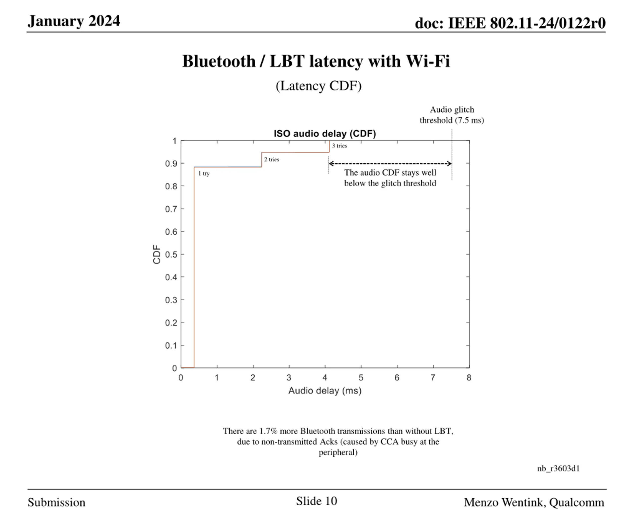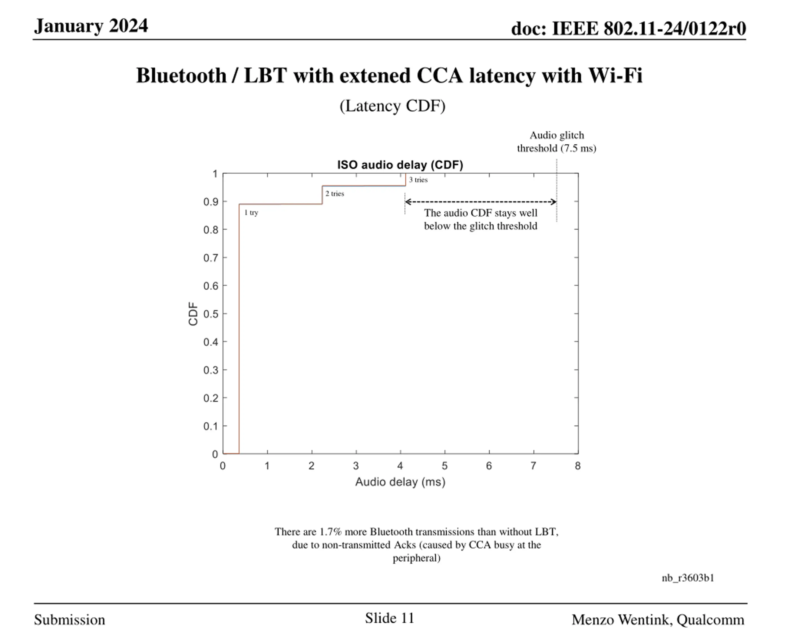 January 2024 doc: IEEE 802.11-24/0122r0 Bluetooth / LBT latency with Wi-Fi (Latency CDF) Audio glitch threshold (7.5 ms) 3 tries 2 tries The audio CDF stays well below the glitch threshold 1 try There are 1.7% more Bluetooth transmissions than without LBT, due to non-transmitted Acks (caused by CCA busy at the peripheral) nb_r3603d1 Slide 10 Submission Menzo Wentink, Qualcomm