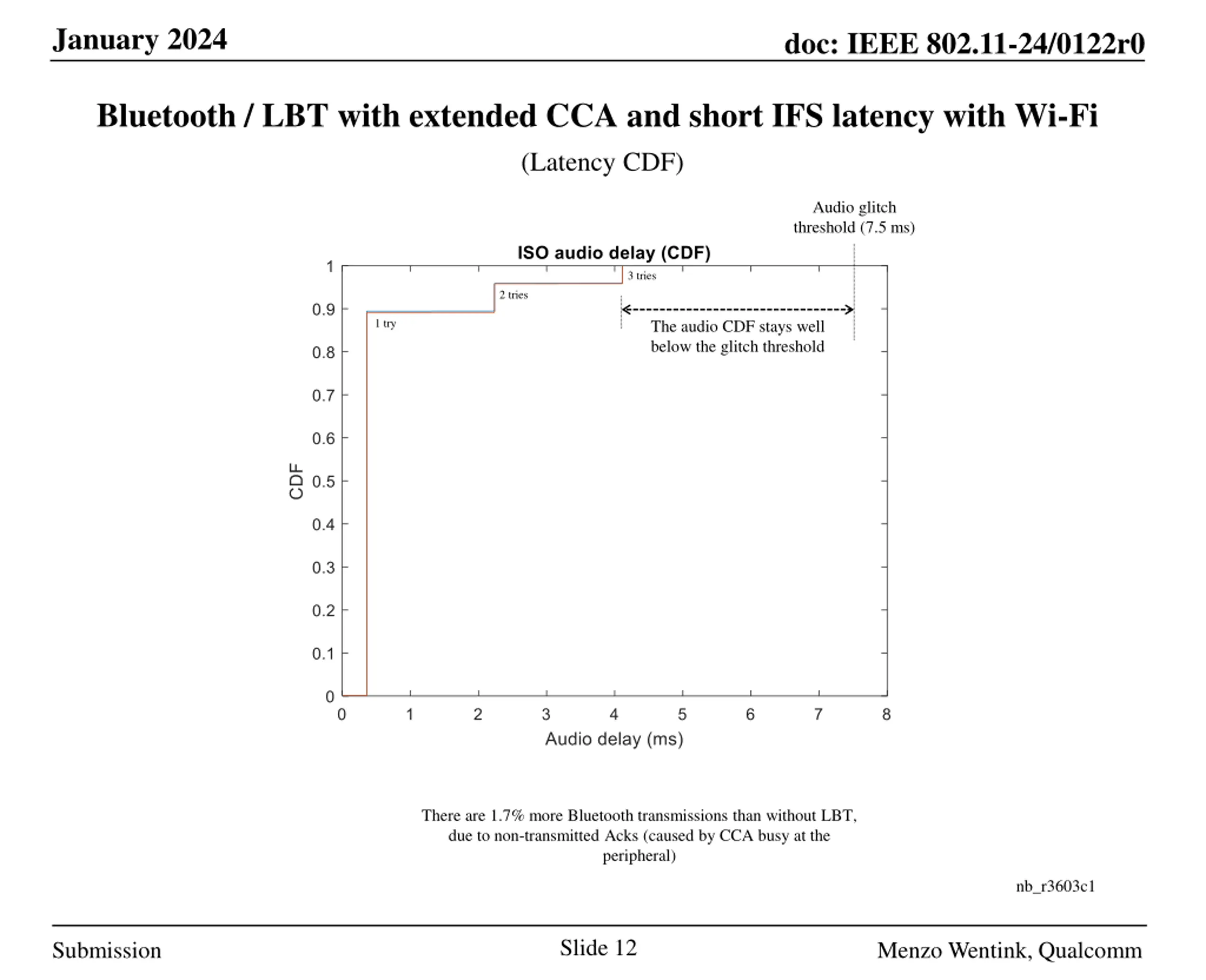 January 2024 doc: IEEE 802.11-24/0122r0 Bluetooth / LBT with extened CCA latency with Wi-Fi (Latency CDF) Audio glitch threshold (7.5 ms) 3 tries 2 tries The audio CDF stays well below the glitch threshold 1 try There are 1.7% more Bluetooth transmissions than without LBT, due to non-transmitted Acks (caused by CCA busy at the peripheral) nb_r3603b1 Slide 11 Submission Menzo Wentink, Qualcomm