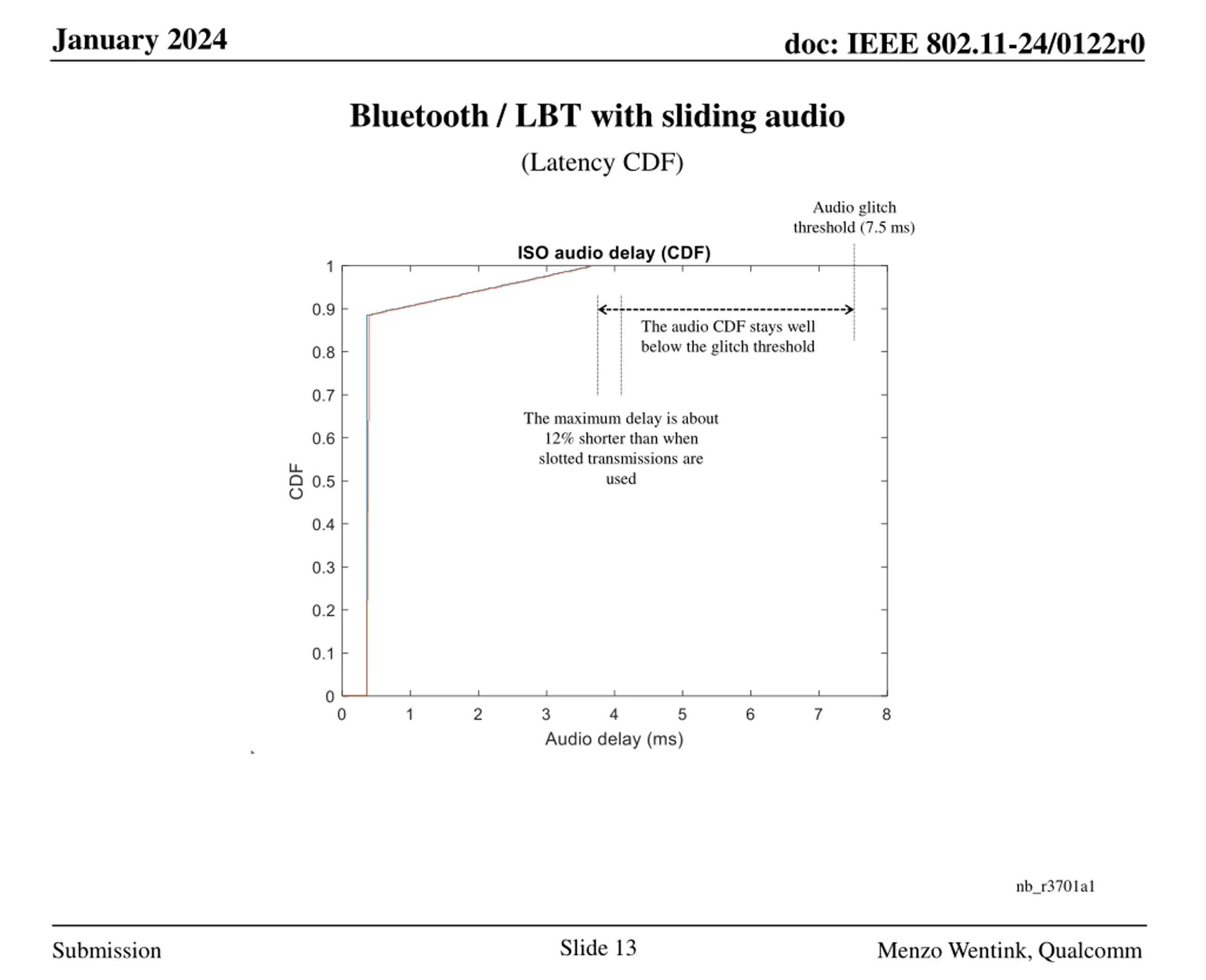 January 2024 doc: IEEE 802.11-24/0122r0 Bluetooth / LBT with sliding audio (Latency CDF) Audio glitch threshold (7.5 ms) The audio CDF stays well below the glitch threshold The maximum delay is about 12% shorter than when slotted transmissions are used nb_r3701a1 Slide 13 Submission Menzo Wentink, Qualcomm