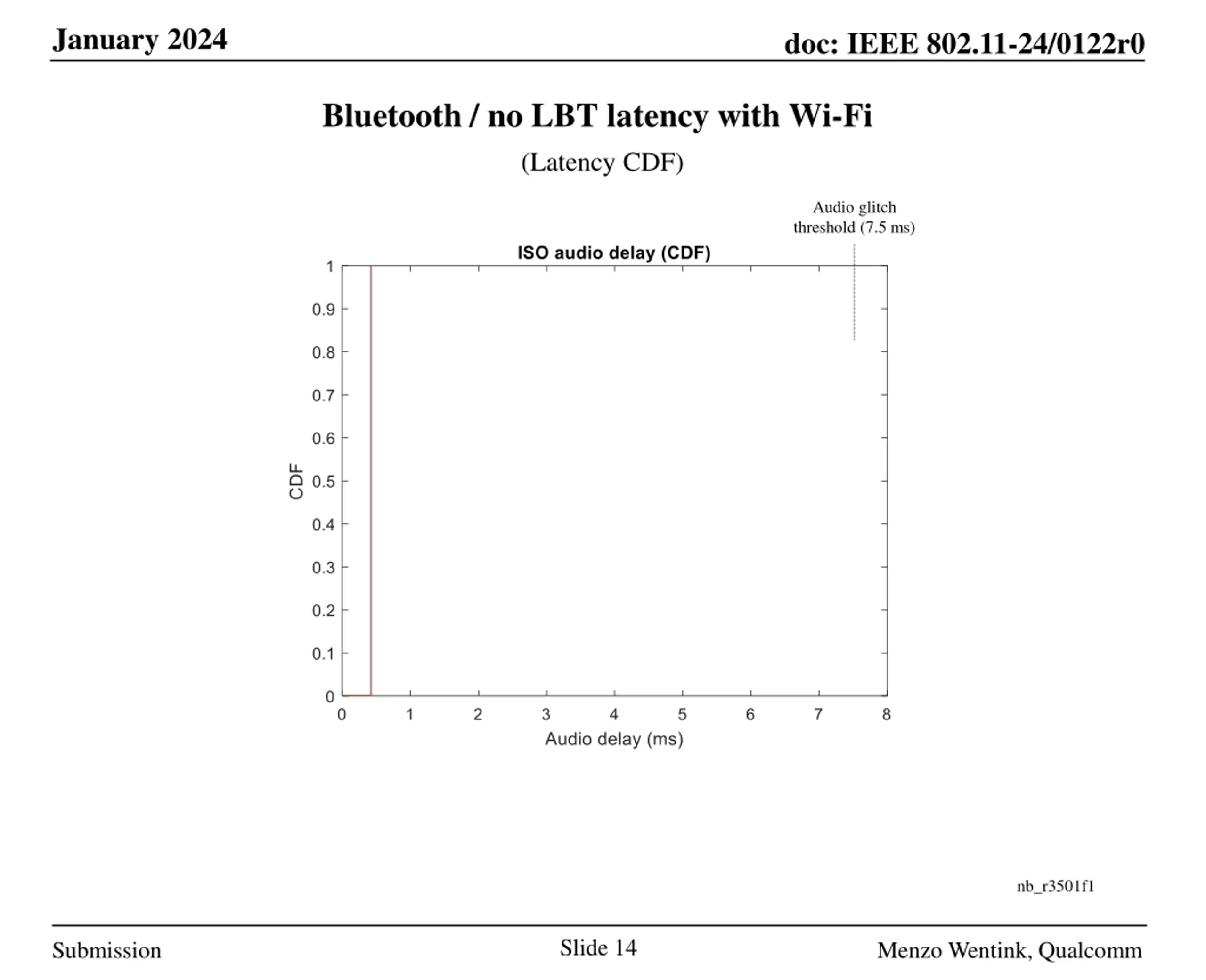 January 2024 doc: IEEE 802.11-24/0122r0 Bluetooth / no LBT latency with Wi-Fi (Latency CDF) Audio glitch threshold (7.5 ms) nb_r3501f1 Slide 14 Submission Menzo Wentink, Qualcomm