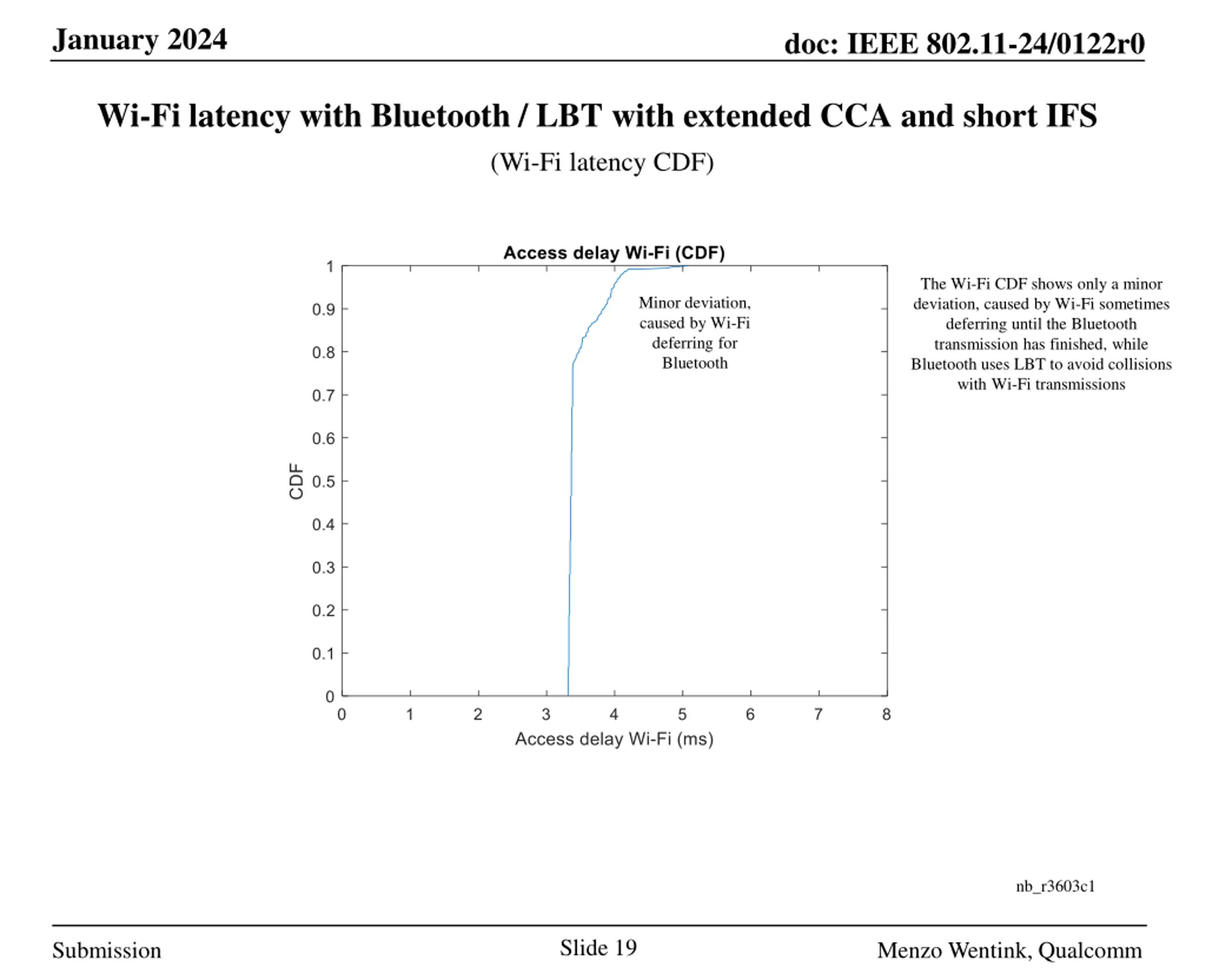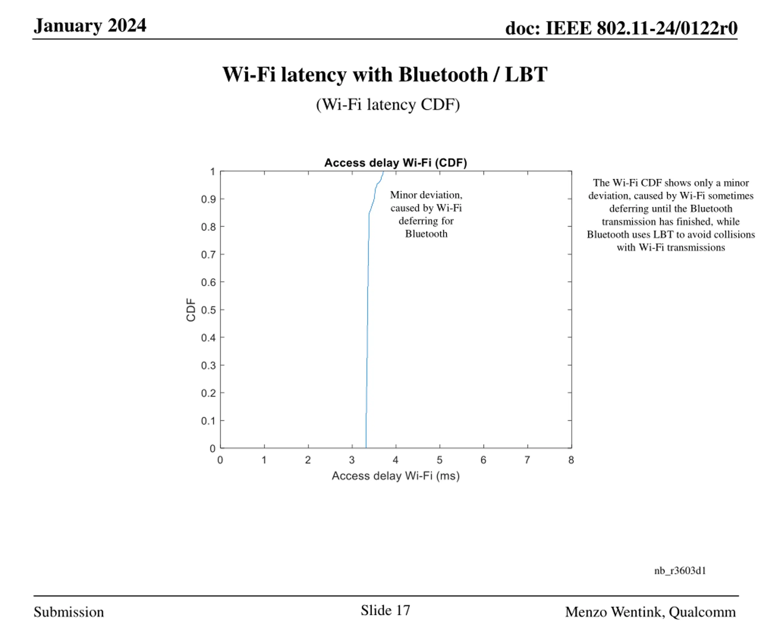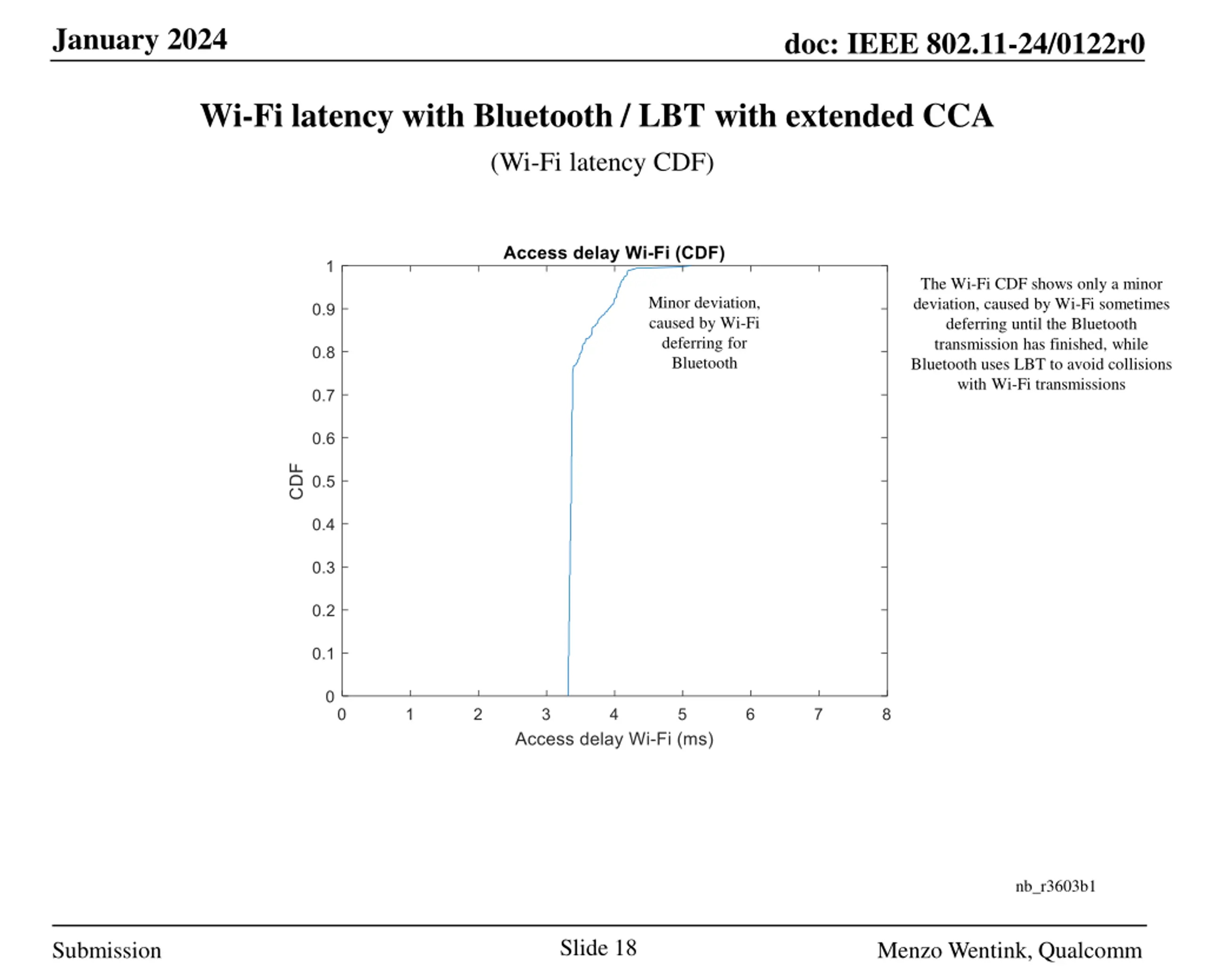 January 2024 doc: IEEE 802.11-24/0122r0 Wi-Fi latency with Bluetooth / LBT (Wi-Fi latency CDF) The Wi-Fi CDF shows only a minor deviation, caused by Wi-Fi sometimes deferring until the Bluetooth transmission has finished, while Bluetooth uses LBT to avoid collisions with Wi-Fi transmissions Minor deviation, caused by Wi-Fi deferring for Bluetooth nb_r3603d1 Slide 17 Submission Menzo Wentink, Qualcomm