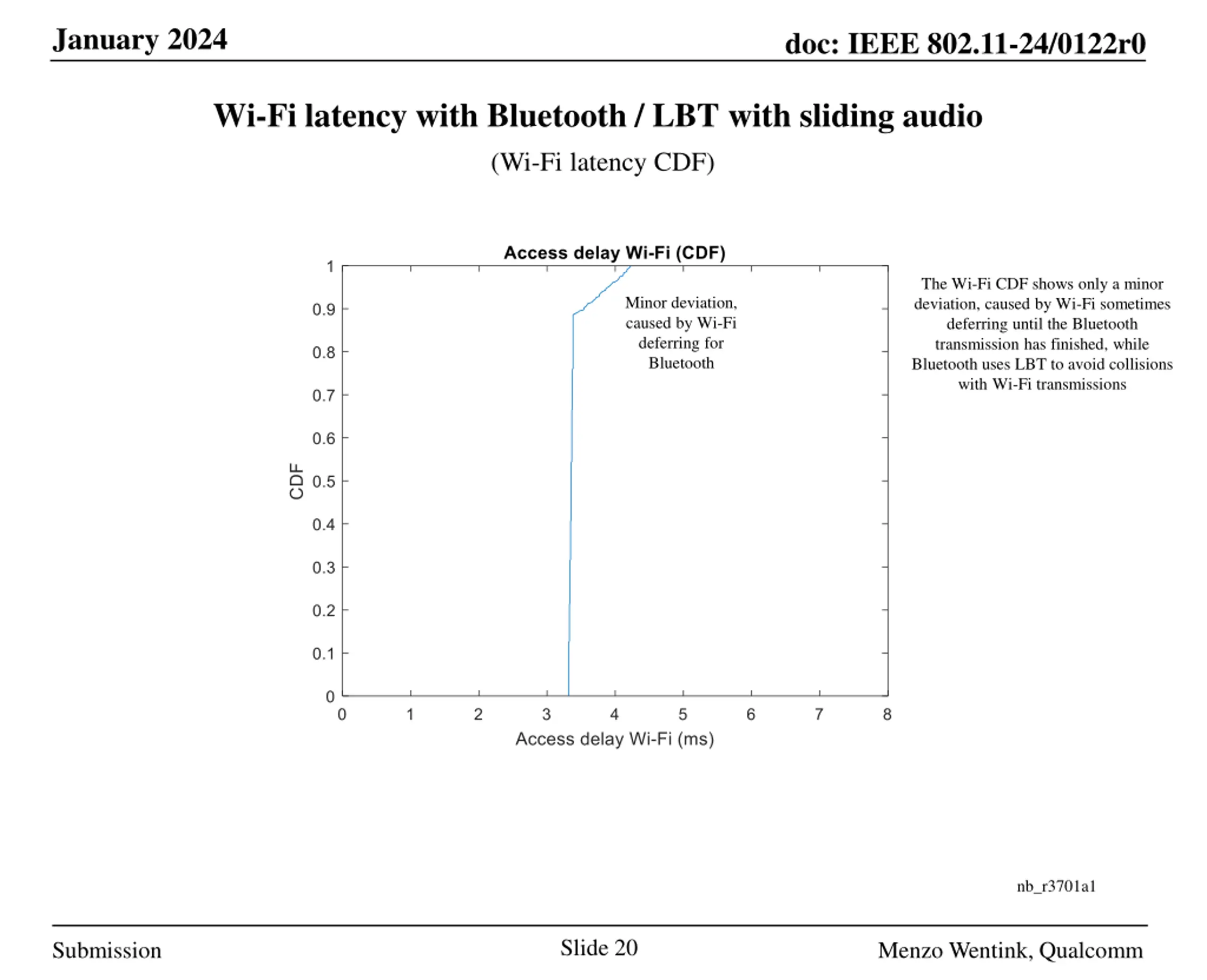 January 2024 doc: IEEE 802.11-24/0122r0 Wi-Fi latency with Bluetooth / LBT with extended CCA and short IFS (Wi-Fi latency CDF) The Wi-Fi CDF shows only a minor deviation, caused by Wi-Fi sometimes deferring until the Bluetooth transmission has finished, while Bluetooth uses LBT to avoid collisions with Wi-Fi transmissions Minor deviation, caused by Wi-Fi deferring for Bluetooth nb_r3603c1 Slide 19 Submission Menzo Wentink, Qualcomm