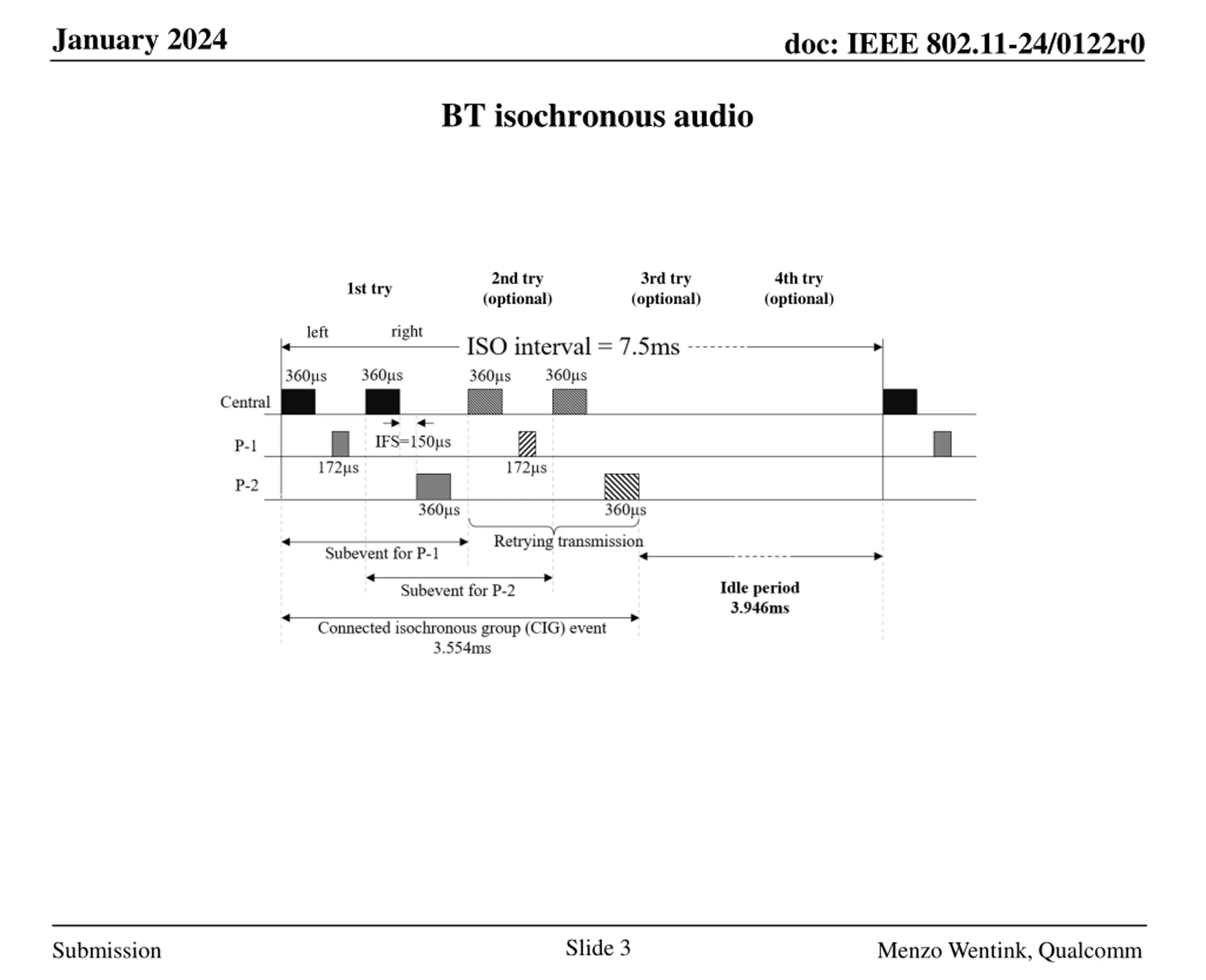 January 2024 doc: IEEE 802.11-24/0122r0 BT isochronous audio 2nd try (optional) 3rd try (optional) 4th try (optional) 1st try right left Slide 3 Submission Menzo Wentink, Qualcomm