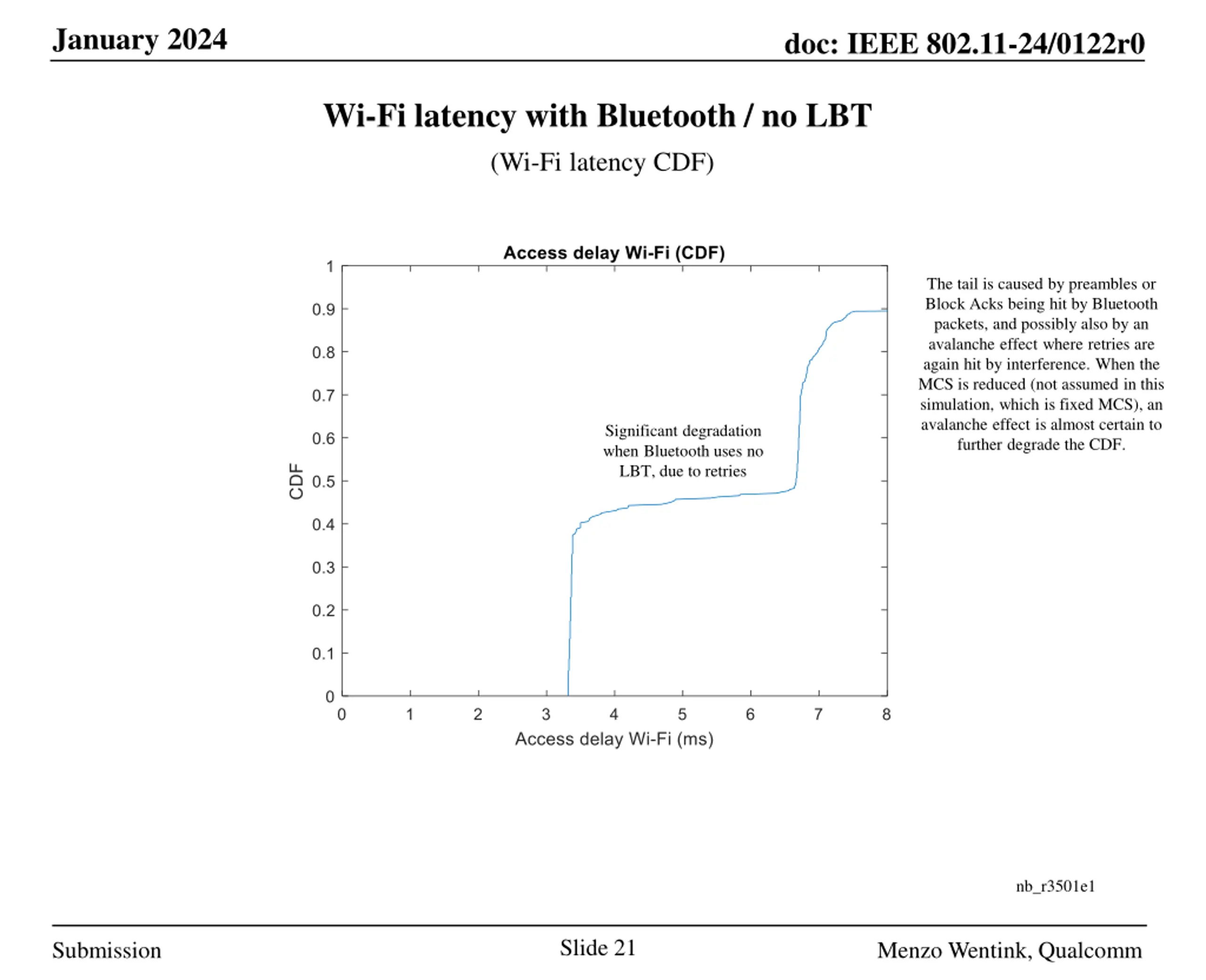 January 2024 doc: IEEE 802.11-24/0122r0 Wi-Fi latency with Bluetooth / no LBT (Wi-Fi latency CDF) The tail is caused by preambles or Block Acks being hit by Bluetooth packets, and possibly also by an avalanche effect where retries are again hit by interference. When the MCS is reduced (not assumed in this simulation, which is fixed MCS), an avalanche effect is almost certain to further degrade the CDF. Significant degradation when Bluetooth uses no LBT, due to retries nb_r3501e1 Slide 21 Submission Menzo Wentink, Qualcomm