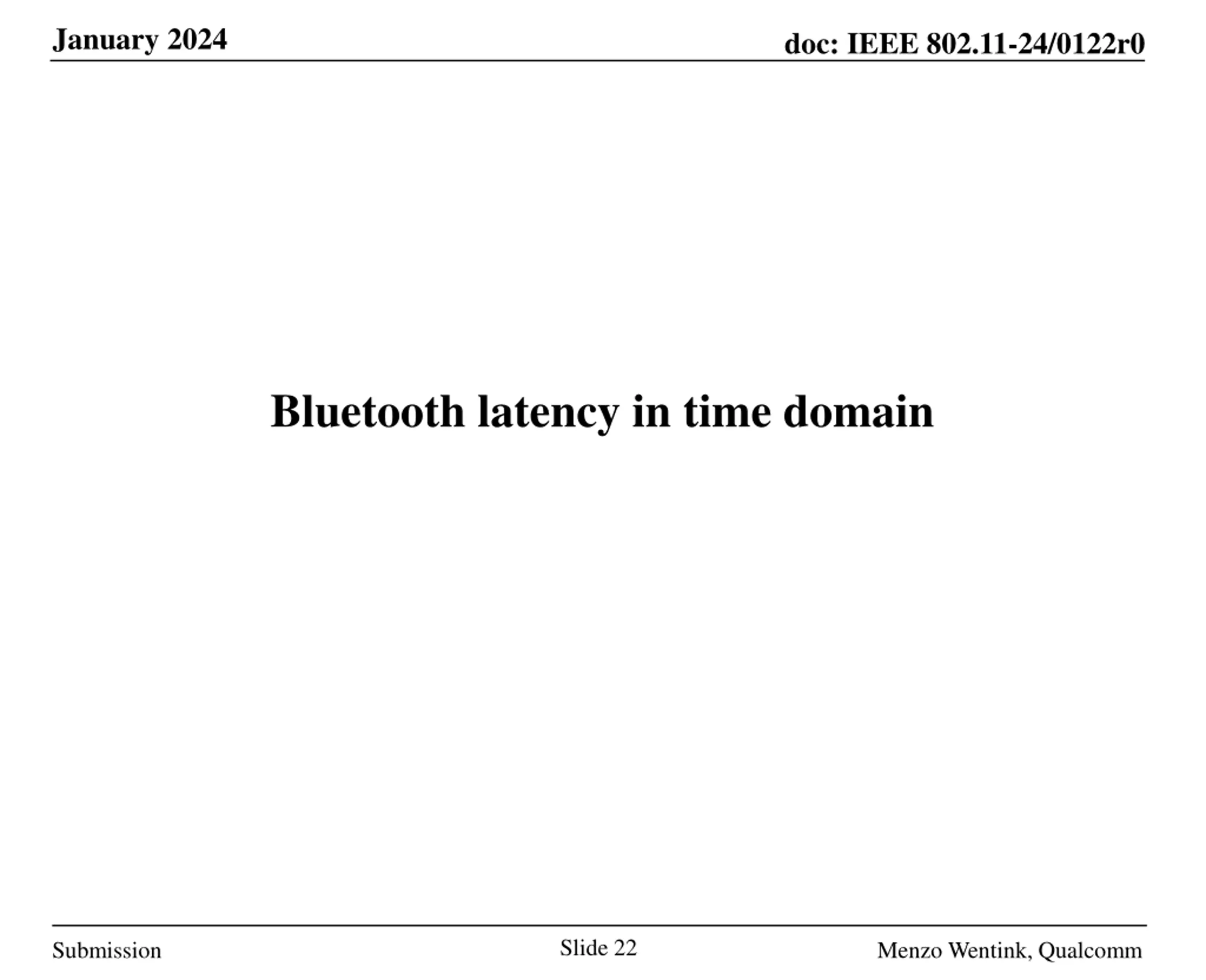 January 2024 doc: IEEE 802.11-24/0122r0 Bluetooth latency in time domain Slide 22 Submission Menzo Wentink, Qualcomm