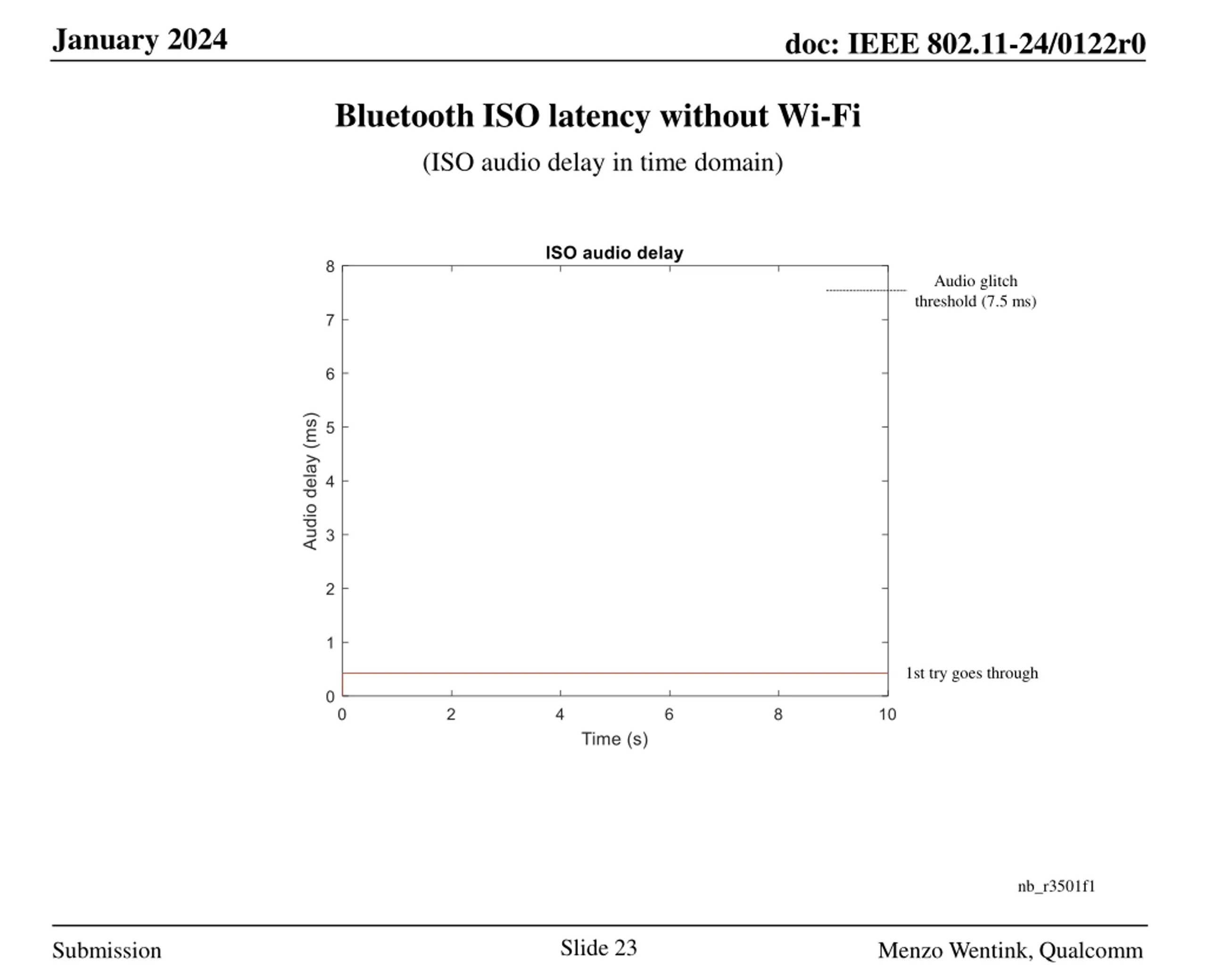 January 2024 doc: IEEE 802.11-24/0122r0 Bluetooth ISO latency without Wi-Fi (ISO audio delay in time domain) Audio glitch threshold (7.5 ms) 1st try goes through nb_r3501f1 Slide 23 Submission Menzo Wentink, Qualcomm