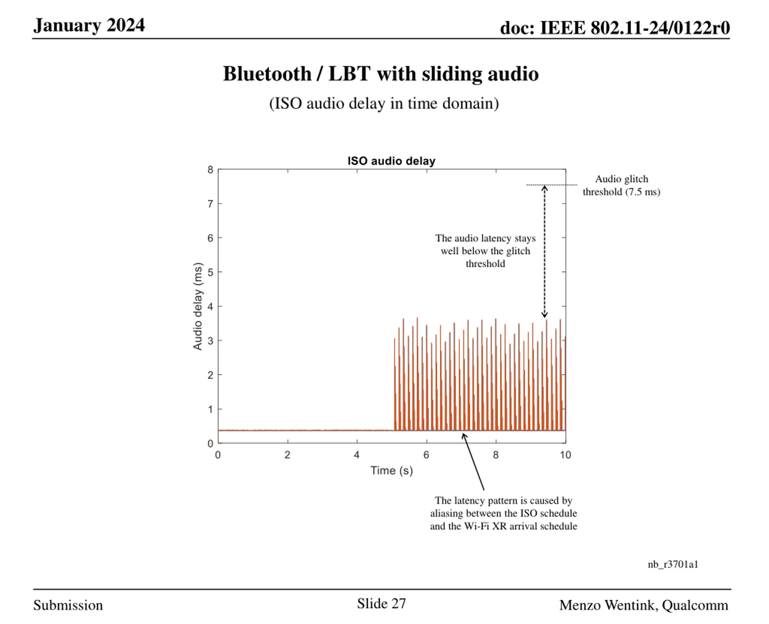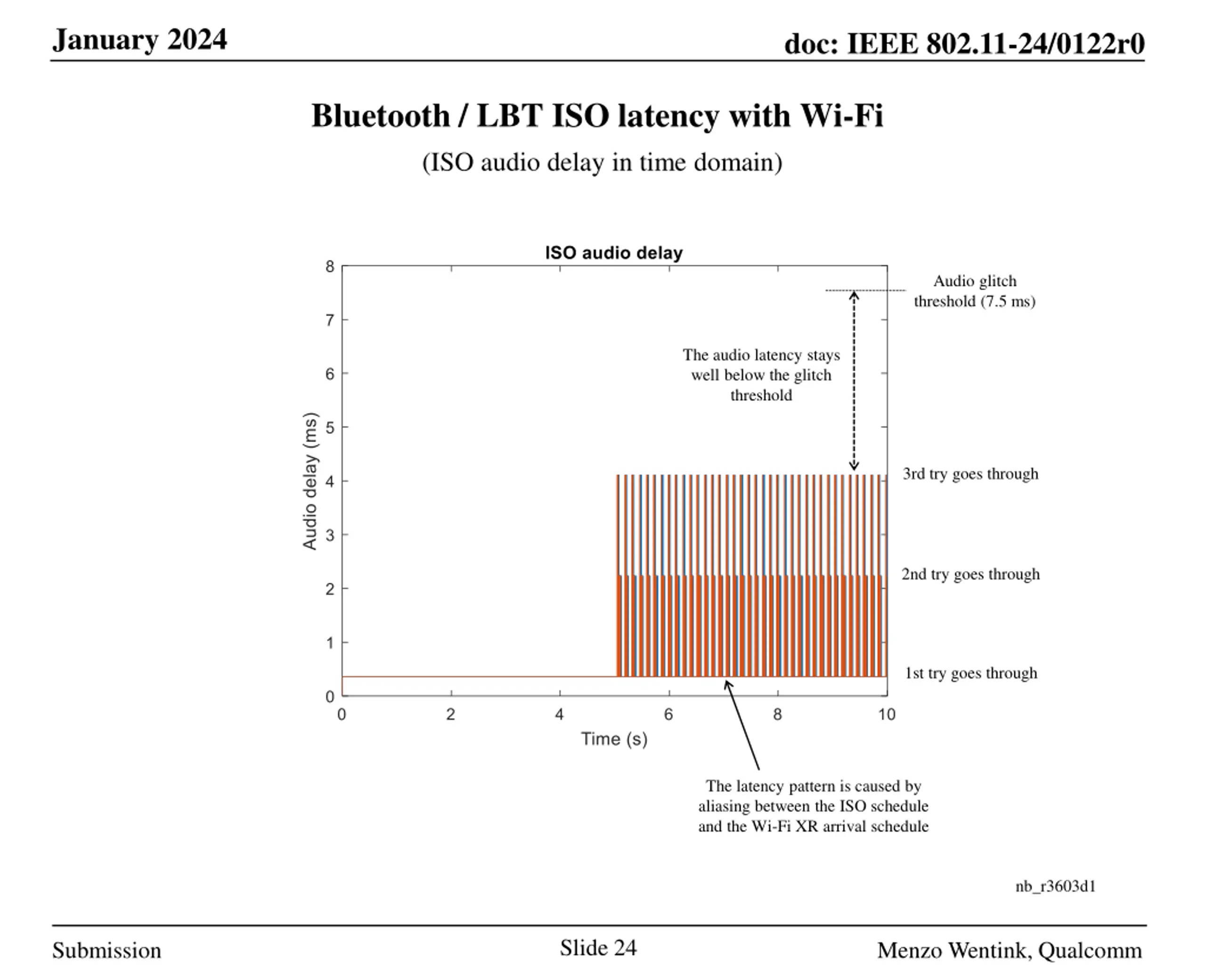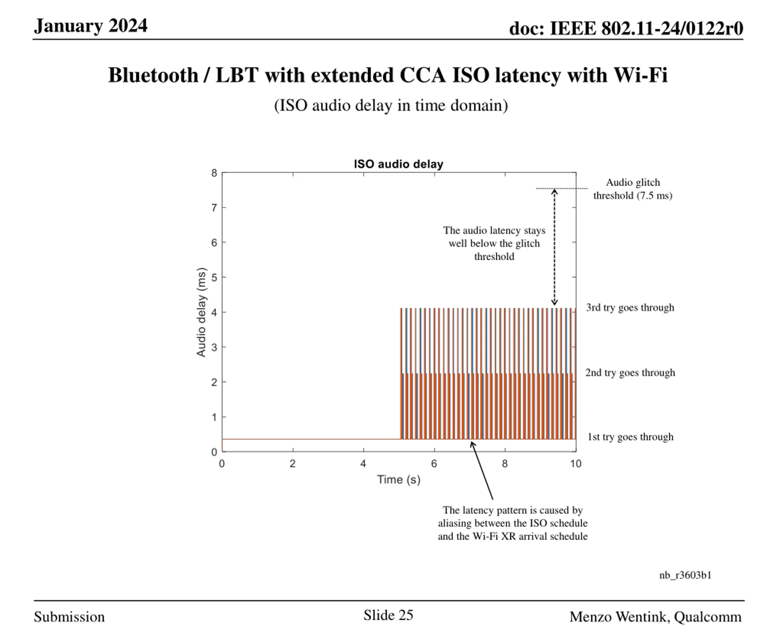 January 2024 doc: IEEE 802.11-24/0122r0 Bluetooth / LBT ISO latency with Wi-Fi (ISO audio delay in time domain) Audio glitch threshold (7.5 ms) The audio latency stays well below the glitch threshold 3rd try goes through 2nd try goes through 1st try goes through The latency pattern is caused by aliasing between the ISO schedule and the Wi-Fi XR arrival schedule nb_r3603d1 Slide 24 Submission Menzo Wentink, Qualcomm