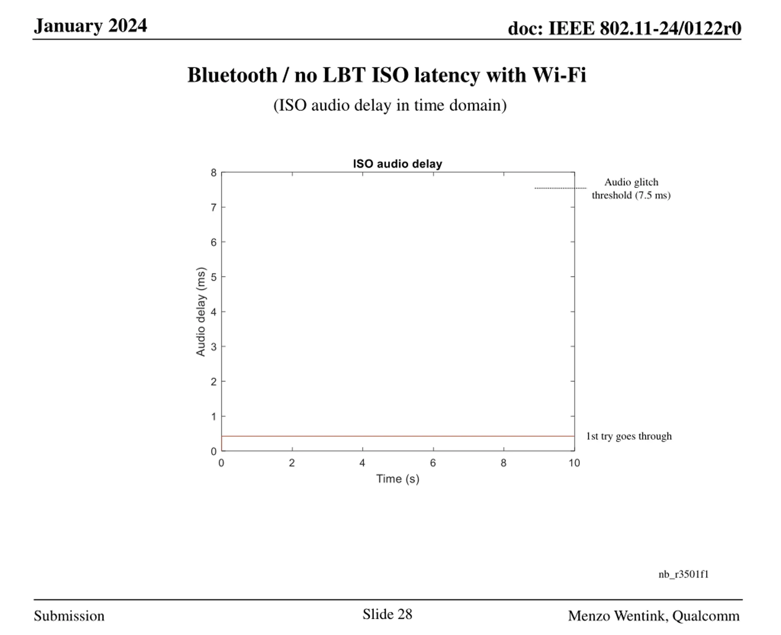 January 2024 doc: IEEE 802.11-24/0122r0 Bluetooth / no LBT ISO latency with Wi-Fi (ISO audio delay in time domain) Audio glitch threshold (7.5 ms) 1st try goes through nb_r3501f1 Slide 28 Submission Menzo Wentink, Qualcomm