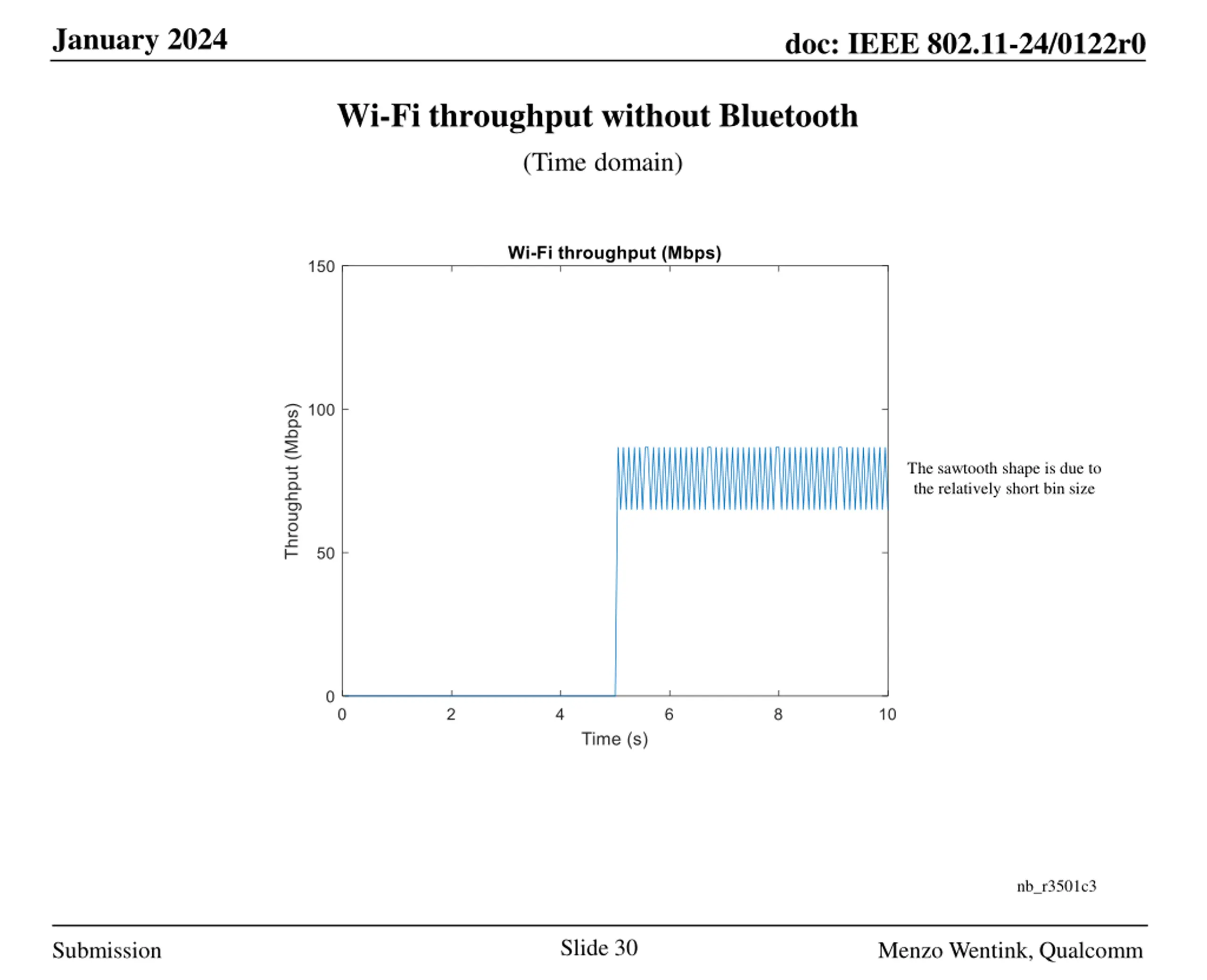 January 2024 doc: IEEE 802.11-24/0122r0 Wi-Fi throughput without Bluetooth (Time domain) The sawtooth shape is due to the relatively short bin size nb_r3501c3 Slide 30 Submission Menzo Wentink, Qualcomm