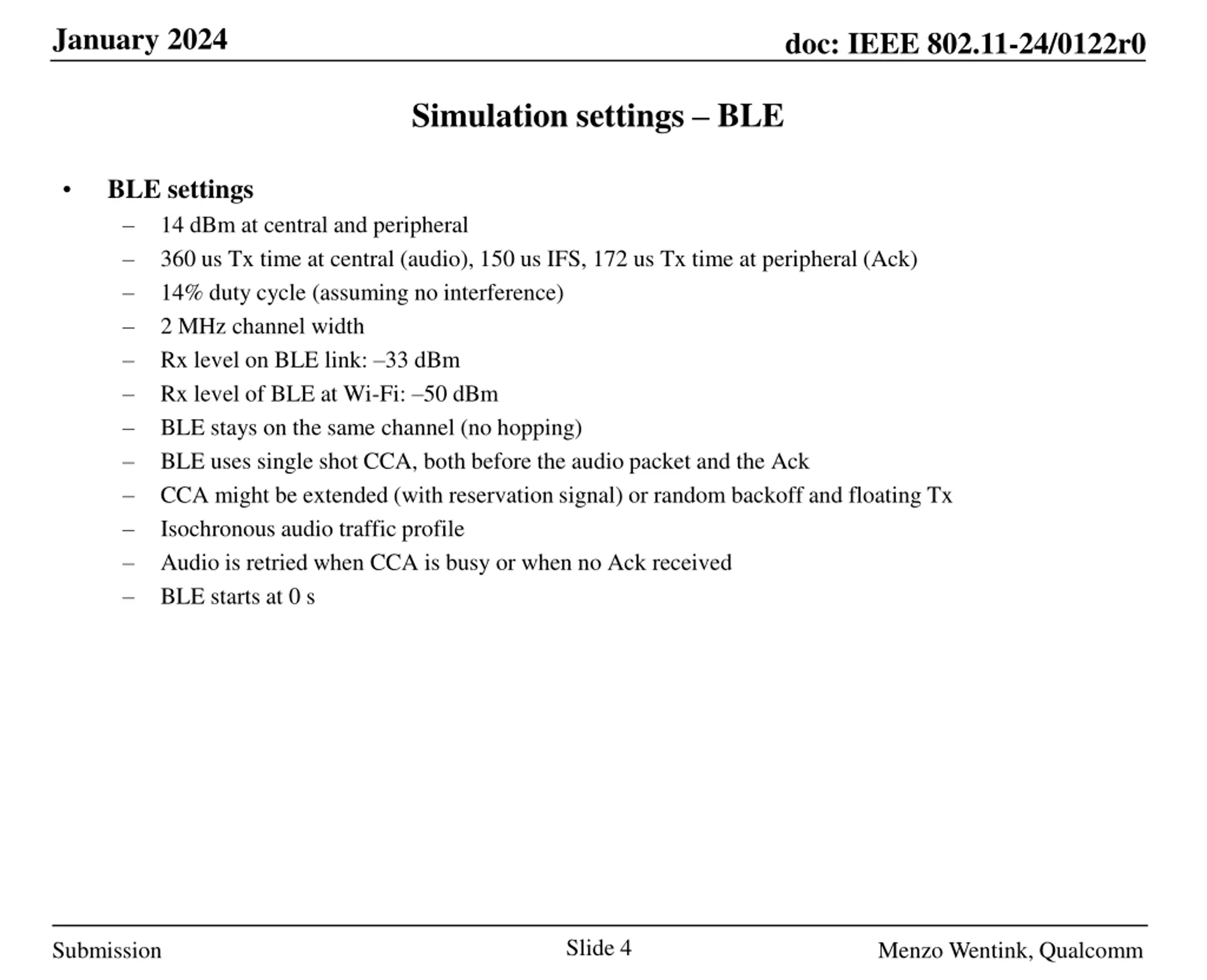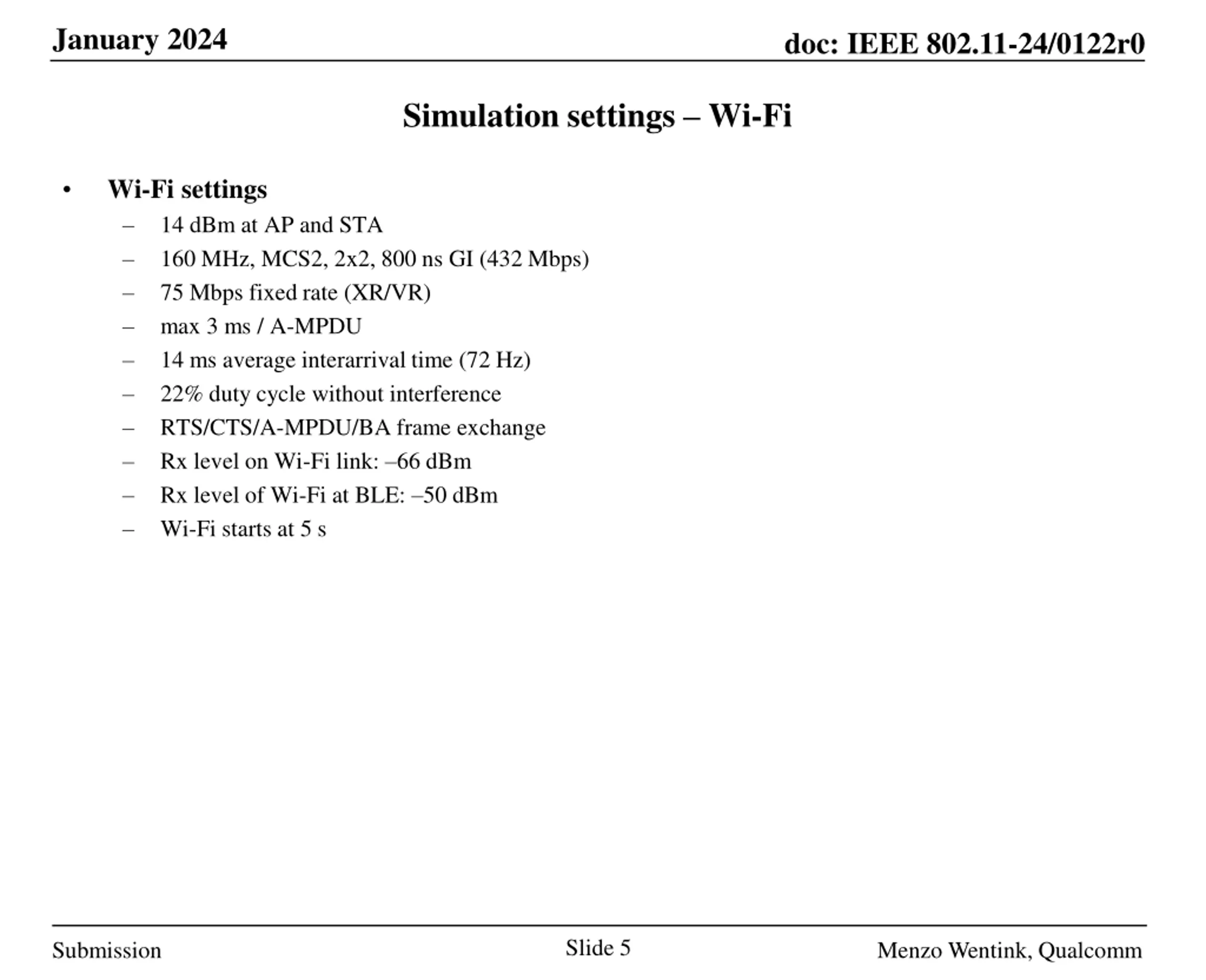 January 2024 doc: IEEE 802.11-24/0122r0 Simulation settings BLE BLE settings 14 dBm at central and peripheral 360 us Tx time at central (audio), 150 us IFS, 172 us Tx time at peripheral (Ack) 14% duty cycle (assuming no interference) 2 MHz channel width Rx level on BLE link: 33 dBm Rx level of BLE at Wi-Fi: 50 dBm BLE stays on the same channel (no hopping) BLE uses single shot CCA, both before the audio packet and the Ack CCA might be extended (with reservation signal) or random backoff and floating Tx Isochronous audio traffic profile Audio is retried when CCA is busy or when no Ack received BLE starts at 0 s Slide 4 Submission Menzo Wentink, Qualcomm