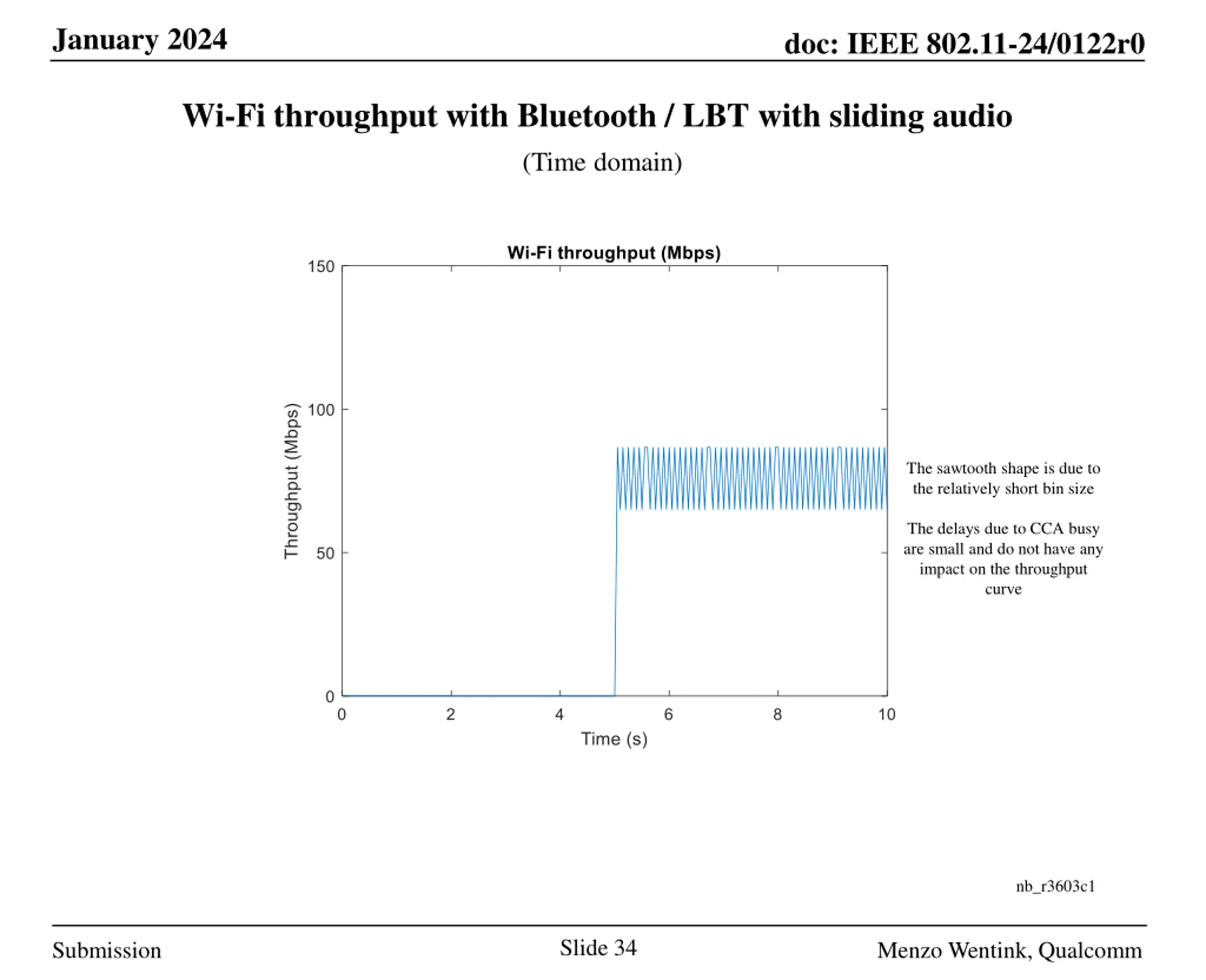 January 2024 doc: IEEE 802.11-24/0122r0 Wi-Fi throughput with Bluetooth / LBT with sliding audio (Time domain) The sawtooth shape is due to the relatively short bin size The delays due to CCA busy are small and do not have any impact on the throughput curve nb_r3603c1 Slide 34 Submission Menzo Wentink, Qualcomm