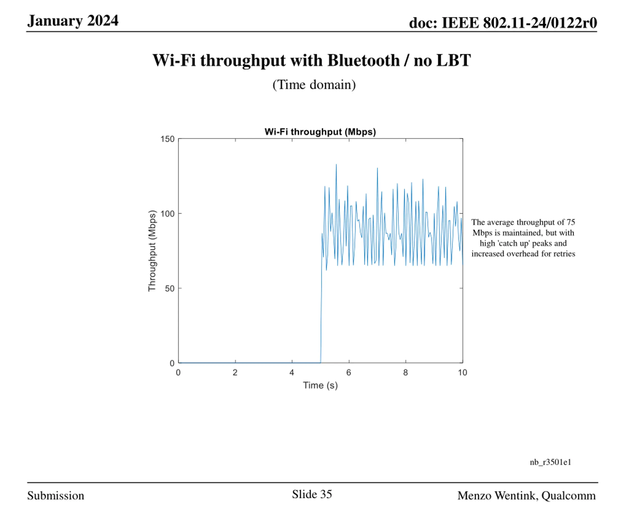 January 2024 doc: IEEE 802.11-24/0122r0 Wi-Fi throughput with Bluetooth / no LBT (Time domain) The average throughput of 75 Mbps is maintained, but with high 'catch up' peaks and increased overhead for retries nb_r3501e1 Slide 35 Submission Menzo Wentink, Qualcomm