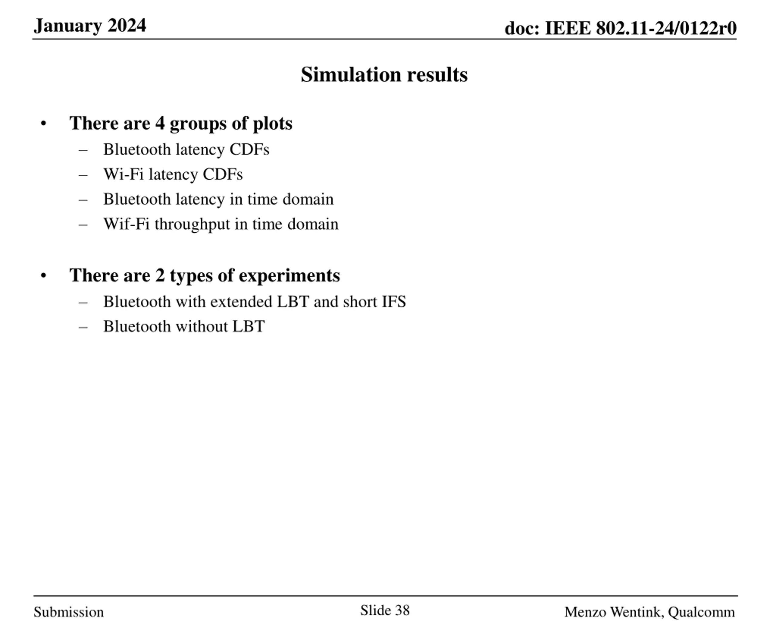 January 2024 doc: IEEE 802.11-24/0122r0 Simulation results There are 4 groups of plots Bluetooth latency CDFs Wi-Fi latency CDFs Bluetooth latency in time domain Wif-Fi throughput in time domain There are 2 types of experiments Bluetooth with extended LBT and short IFS Bluetooth without LBT Slide 38 Submission Menzo Wentink, Qualcomm