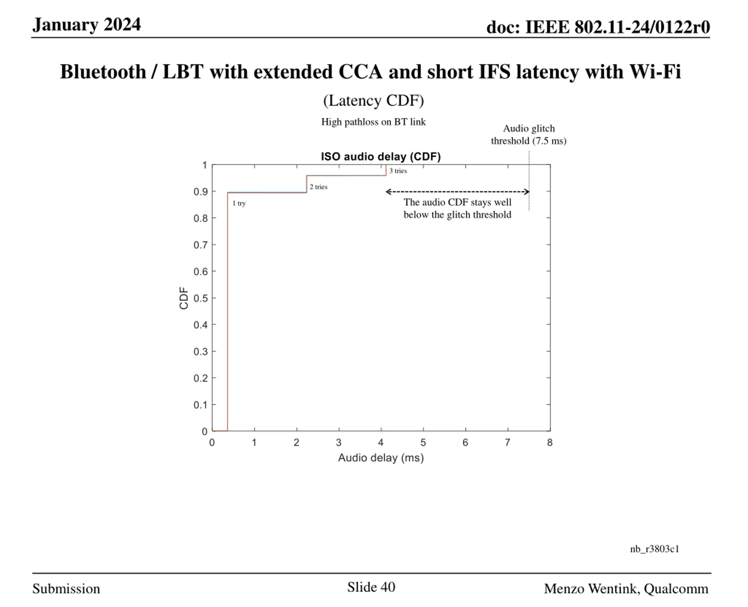 January 2024 doc: IEEE 802.11-24/0122r0 Bluetooth / LBT with extended CCA and short IFS latency with Wi-Fi (Latency CDF) High pathloss on BT link Audio glitch threshold (7.5 ms) 3 tries 2 tries The audio CDF stays well below the glitch threshold 1 try nb_r3803c1 Slide 40 Submission Menzo Wentink, Qualcomm