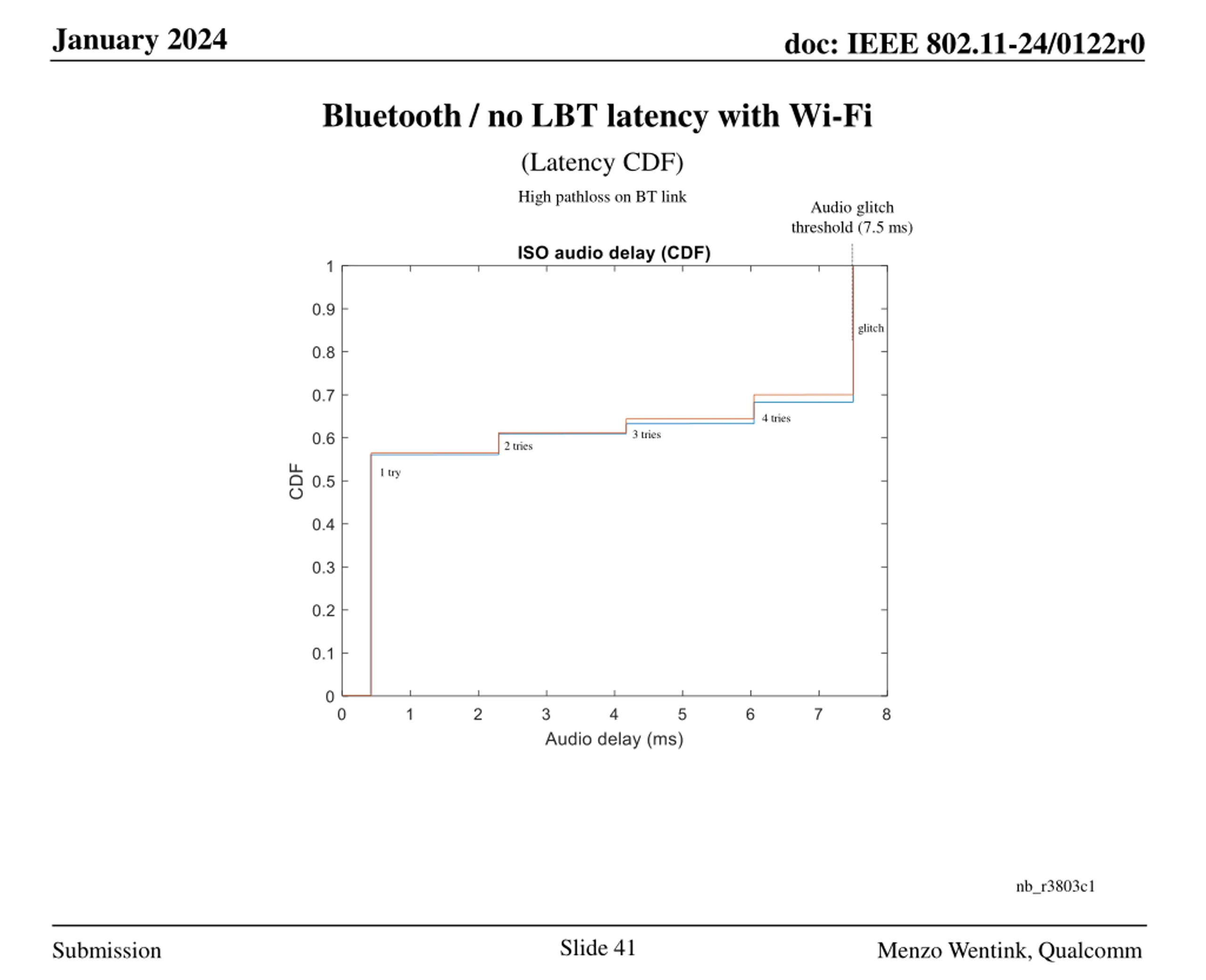 January 2024 doc: IEEE 802.11-24/0122r0 Bluetooth / no LBT latency with Wi-Fi (Latency CDF) High pathloss on BT link Audio glitch threshold (7.5 ms) glitch 4 tries 3 tries 2 tries 1 try nb_r3803c1 Slide 41 Submission Menzo Wentink, Qualcomm