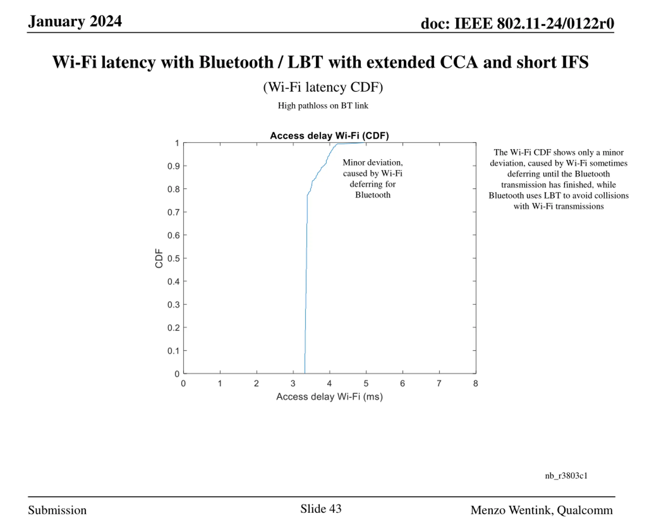January 2024 doc: IEEE 802.11-24/0122r0 Wi-Fi latency with Bluetooth / LBT with extended CCA and short IFS (Wi-Fi latency CDF) High pathloss on BT link The Wi-Fi CDF shows only a minor deviation, caused by Wi-Fi sometimes deferring until the Bluetooth transmission has finished, while Bluetooth uses LBT to avoid collisions with Wi-Fi transmissions Minor deviation, caused by Wi-Fi deferring for Bluetooth nb_r3803c1 Slide 43 Submission Menzo Wentink, Qualcomm