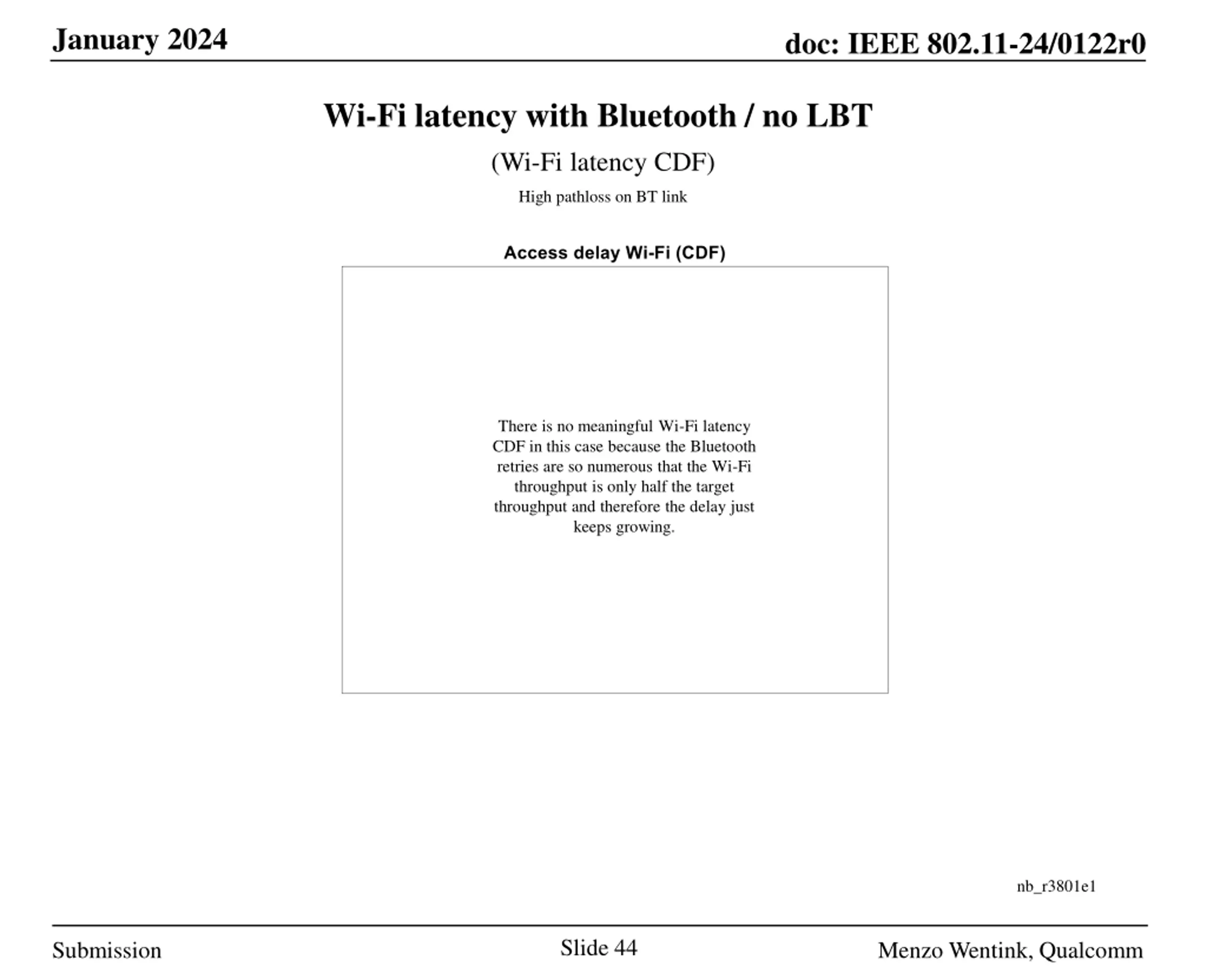 January 2024 doc: IEEE 802.11-24/0122r0 Wi-Fi latency with Bluetooth / no LBT (Wi-Fi latency CDF) High pathloss on BT link There is no meaningful Wi-Fi latency CDF in this case because the Bluetooth retries are so numerous that the Wi-Fi throughput is only half the target throughput and therefore the delay just keeps growing. nb_r3801e1 Slide 44 Submission Menzo Wentink, Qualcomm