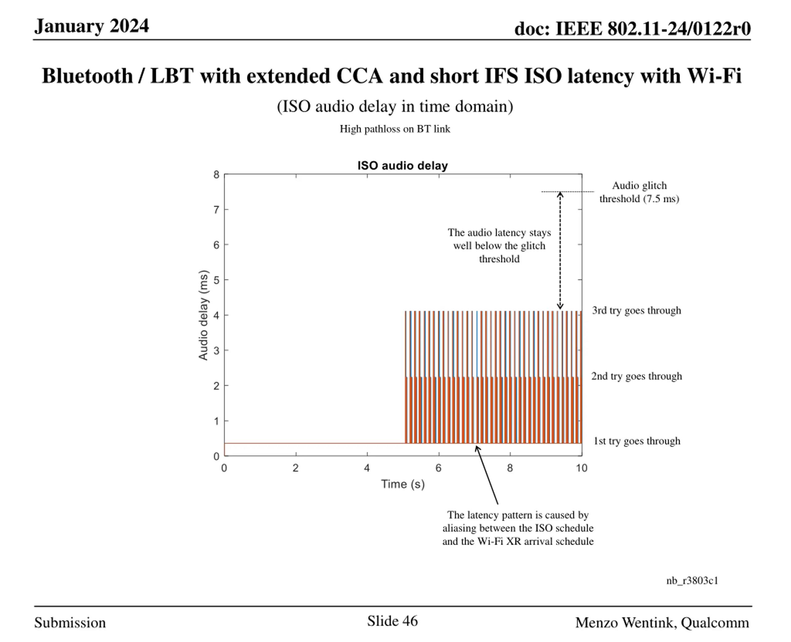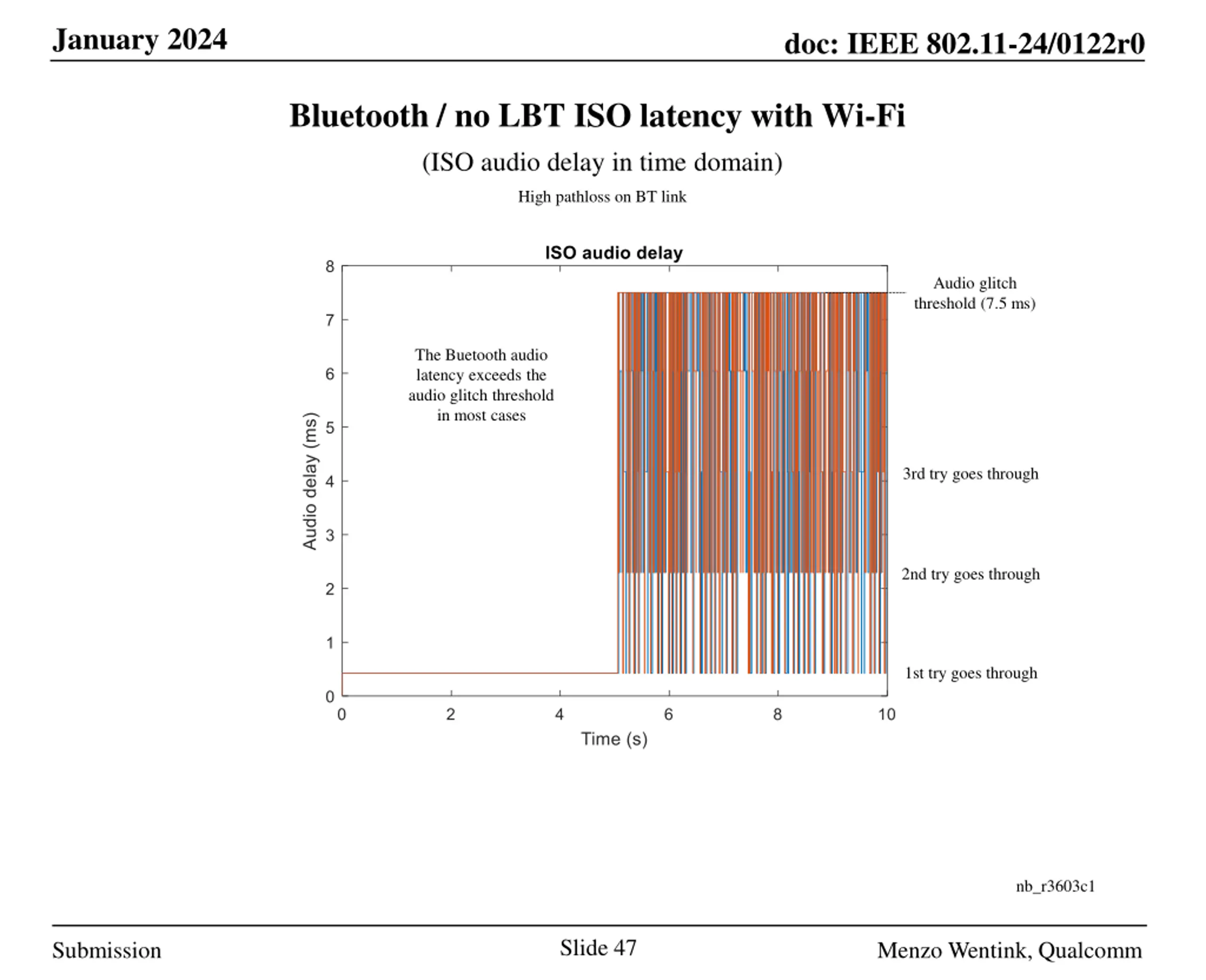 January 2024 doc: IEEE 802.11-24/0122r0 Bluetooth / LBT with extended CCA and short IFS ISO latency with Wi-Fi (ISO audio delay in time domain) High pathloss on BT link Audio glitch threshold (7.5 ms) The audio latency stays well below the glitch threshold 3rd try goes through 2nd try goes through 1st try goes through The latency pattern is caused by aliasing between the ISO schedule and the Wi-Fi XR arrival schedule nb_r3803c1 Slide 46 Submission Menzo Wentink, Qualcomm