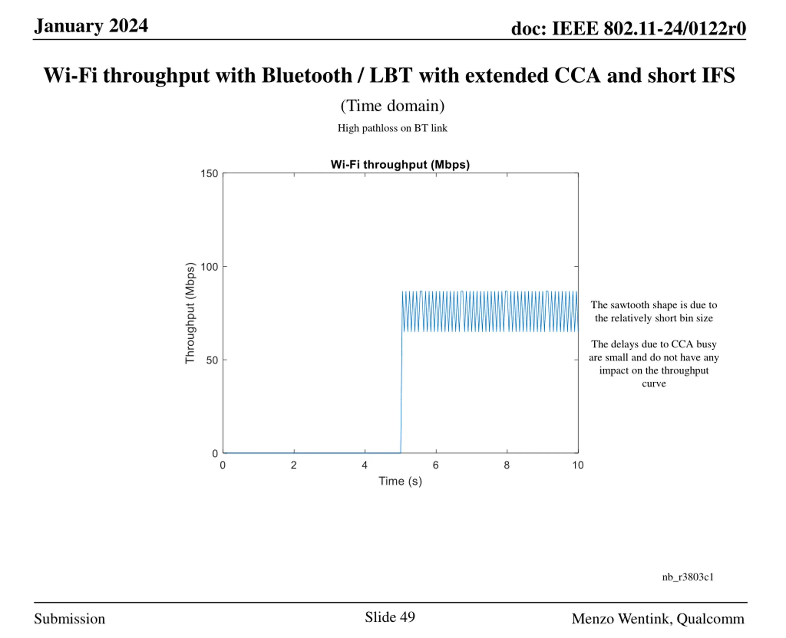 January 2024 doc: IEEE 802.11-24/0122r0 Wi-Fi throughput with Bluetooth / LBT with extended CCA and short IFS (Time domain) High pathloss on BT link The sawtooth shape is due to the relatively short bin size The delays due to CCA busy are small and do not have any impact on the throughput curve nb_r3803c1 Slide 49 Submission Menzo Wentink, Qualcomm