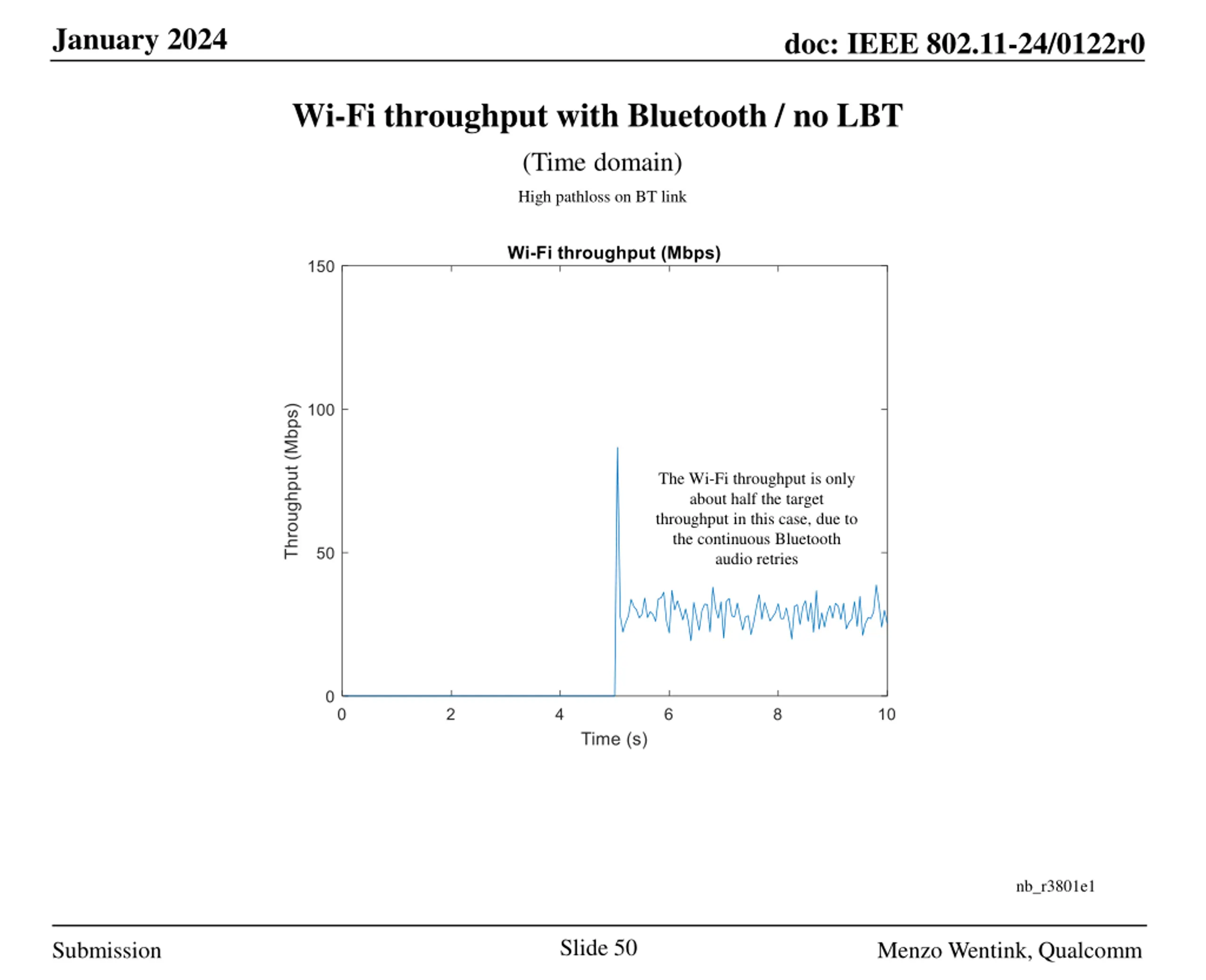 January 2024 doc: IEEE 802.11-24/0122r0 Wi-Fi throughput with Bluetooth / no LBT (Time domain) High pathloss on BT link The Wi-Fi throughput is only about half the target throughput in this case, due to the continuous Bluetooth audio retries nb_r3801e1 Slide 50 Submission Menzo Wentink, Qualcomm