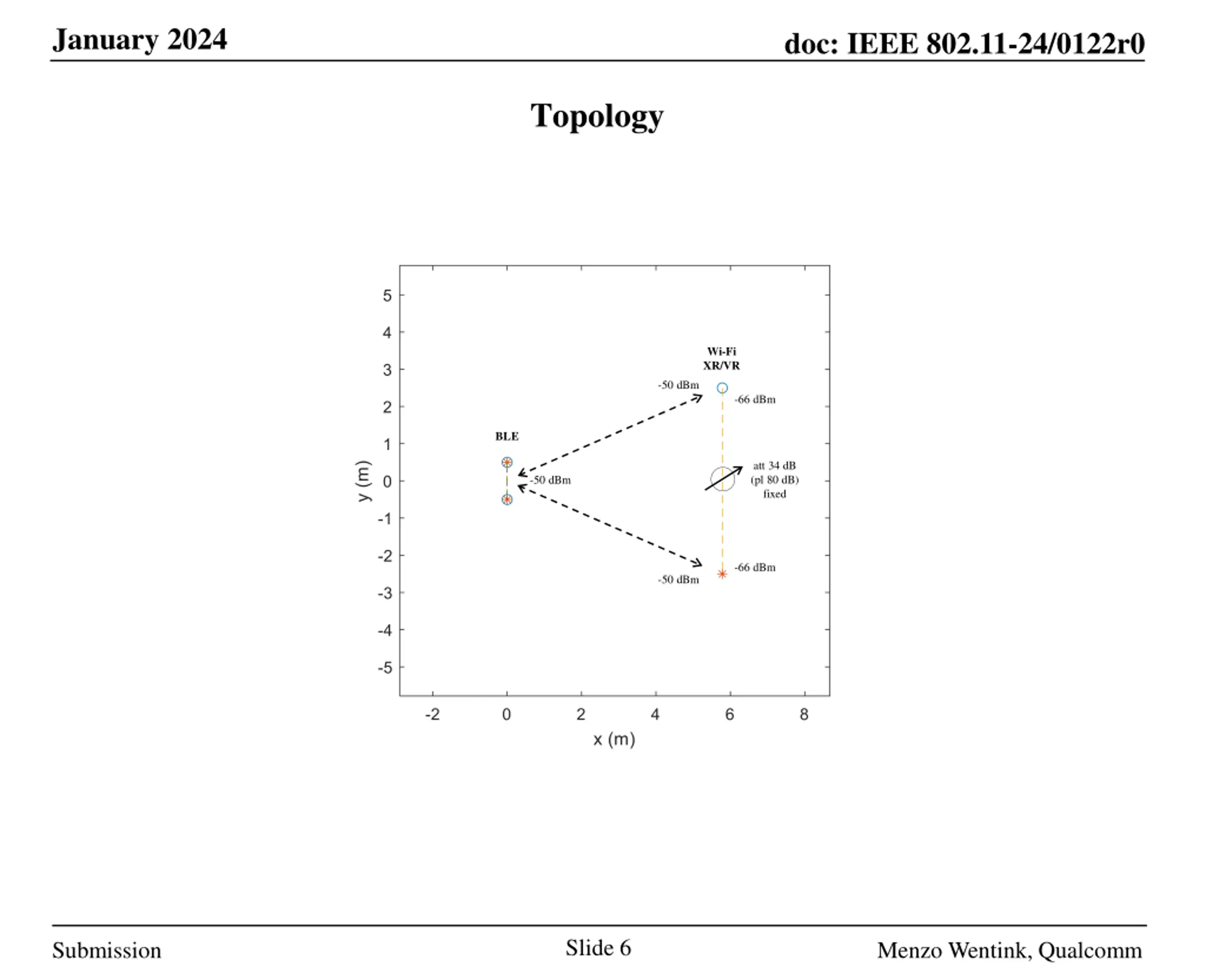 January 2024 doc: IEEE 802.11-24/0122r0 Topology Wi-Fi XR/VR -50 dBm -66 dBm BLE att 34 dB (pl 80 dB) fixed -50 dBm -66 dBm -50 dBm Slide 6 Submission Menzo Wentink, Qualcomm