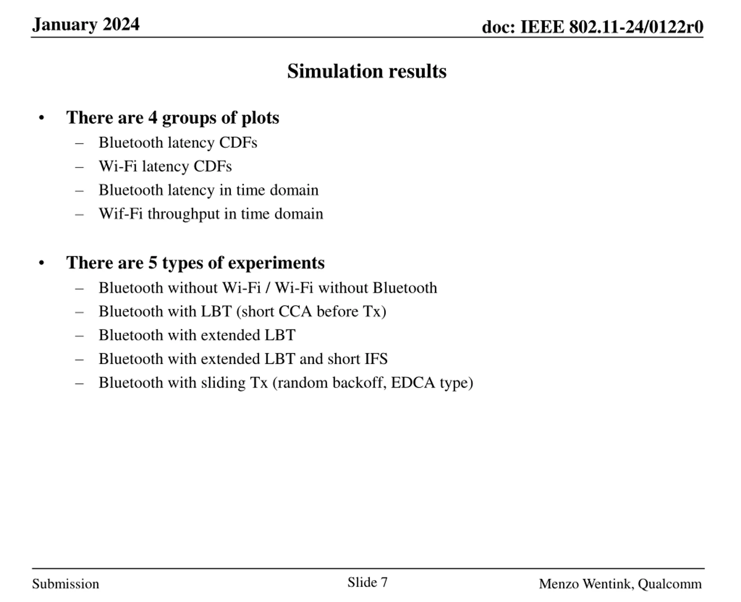 January 2024 doc: IEEE 802.11-24/0122r0 Simulation results There are 4 groups of plots Bluetooth latency CDFs Wi-Fi latency CDFs Bluetooth latency in time domain Wif-Fi throughput in time domain There are 5 types of experiments Bluetooth without Wi-Fi / Wi-Fi without Bluetooth Bluetooth with LBT (short CCA before Tx) Bluetooth with extended LBT Bluetooth with extended LBT and short IFS Bluetooth with sliding Tx (random backoff, EDCA type) Slide 7 Submission Menzo Wentink, Qualcomm