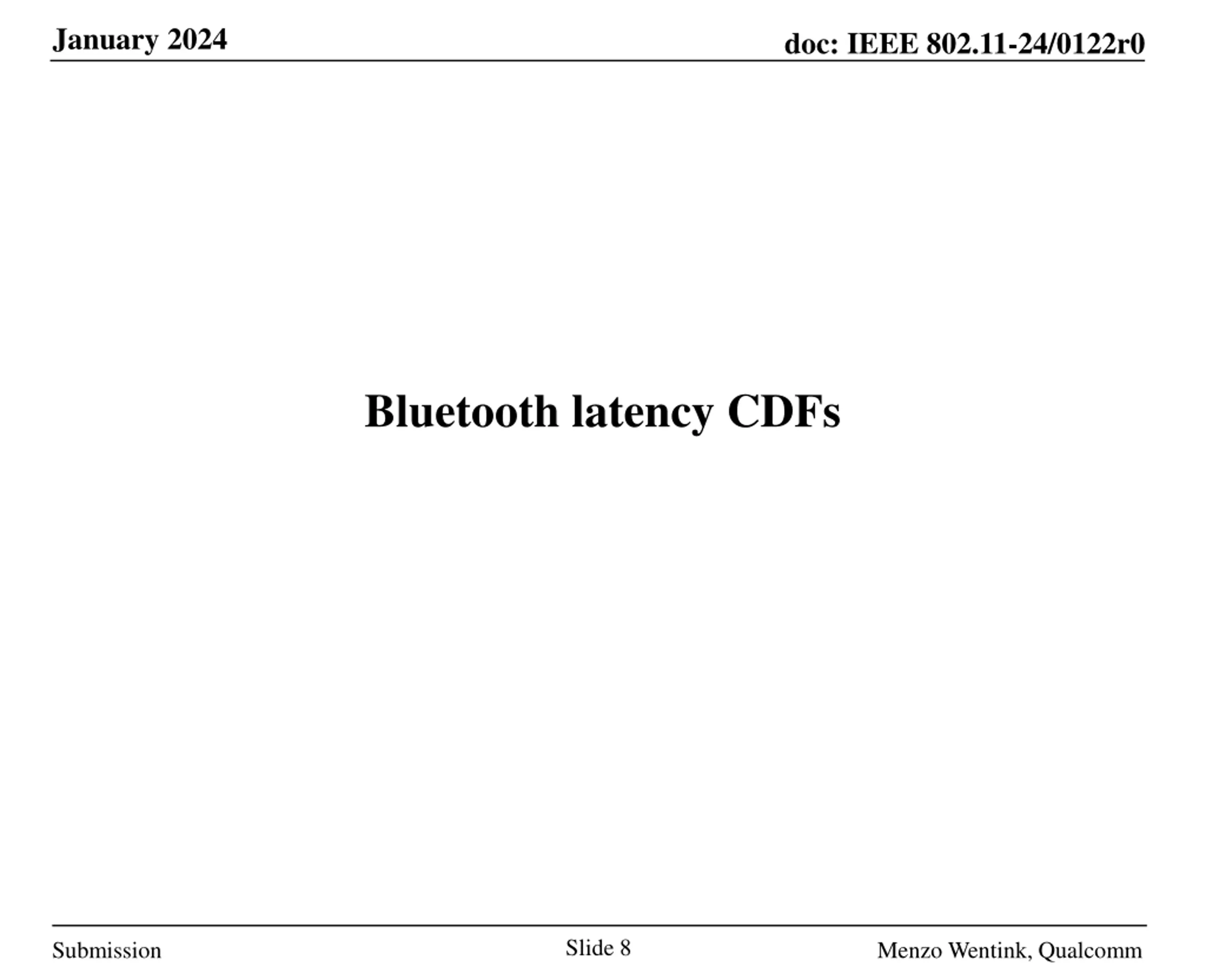 January 2024 doc: IEEE 802.11-24/0122r0 Bluetooth latency CDFs Slide 8 Submission Menzo Wentink, Qualcomm