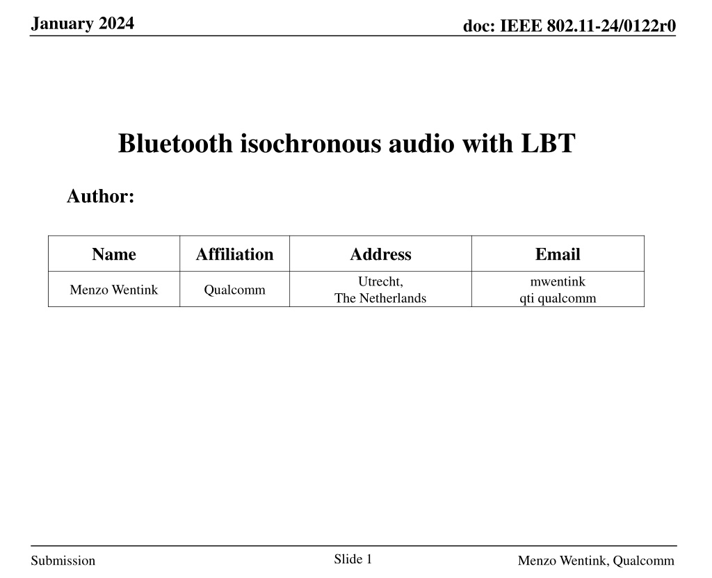 January 2024 doc: IEEE 802.11-24/0122r0 Bluetooth isochronous audio with LBT Author: Name Affiliation Address Email Utrecht, mwentink qti qualcomm Menzo Wentink Qualcomm The Netherlands Slide 1 Submission Menzo Wentink, Qualcomm