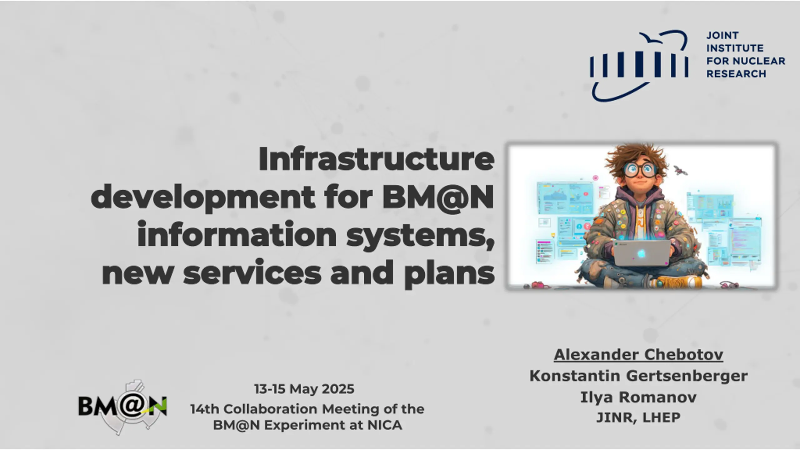 Infrastructure Infrastructure development for BM@N development for BM@N information systems, information systems, new services and plans new services and plans Alexander Chebotov Konstantin Gertsenberger Ilya Romanov JINR, LHEP 13-15 May 2025 14th Collaboration Meeting of the BM@N Experiment at NICA