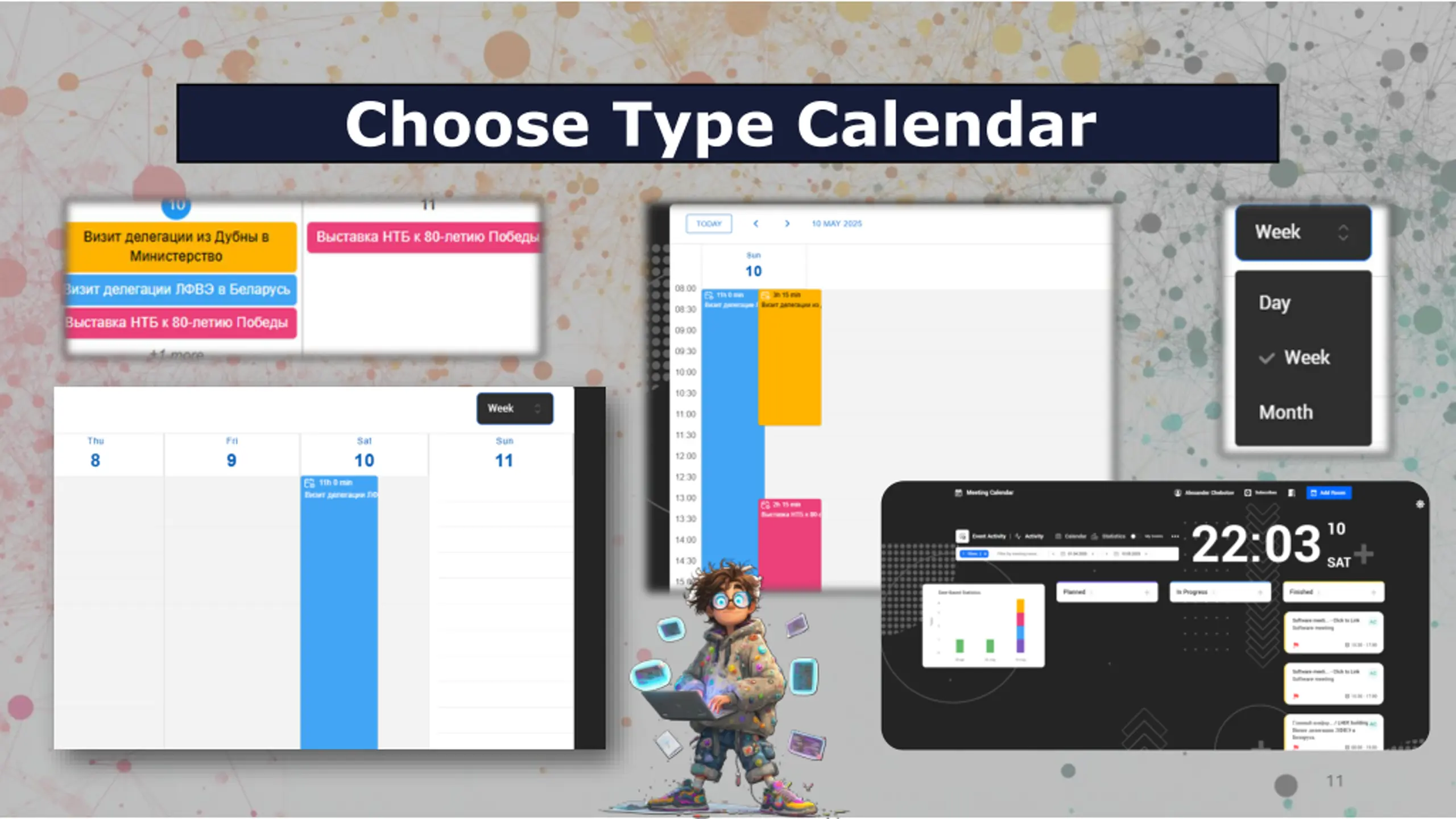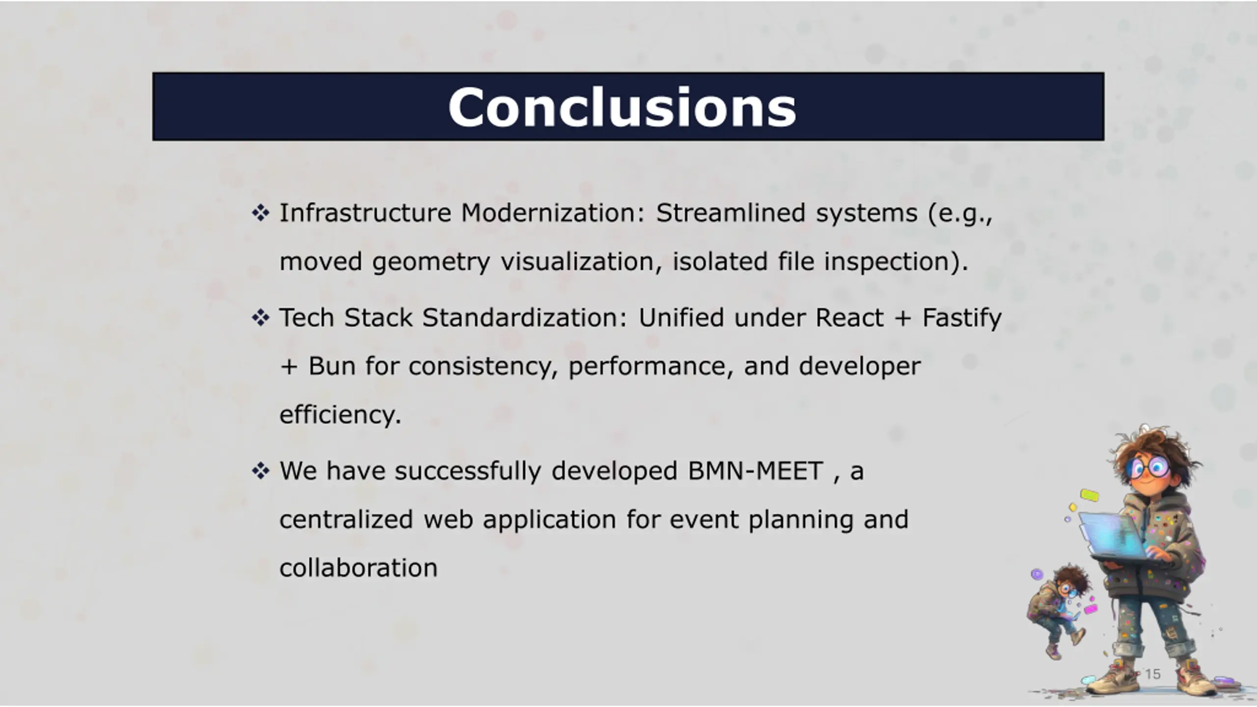 Conclusions Infrastructure Modernization: Streamlined systems (e.g., moved geometry visualization, isolated file inspection). Tech Stack Standardization: Unified under React + Fastify + Bun for consistency, performance, and developer efficiency. We have successfully developed BMN-MEET , a centralized web application for event planning and collaboration 15