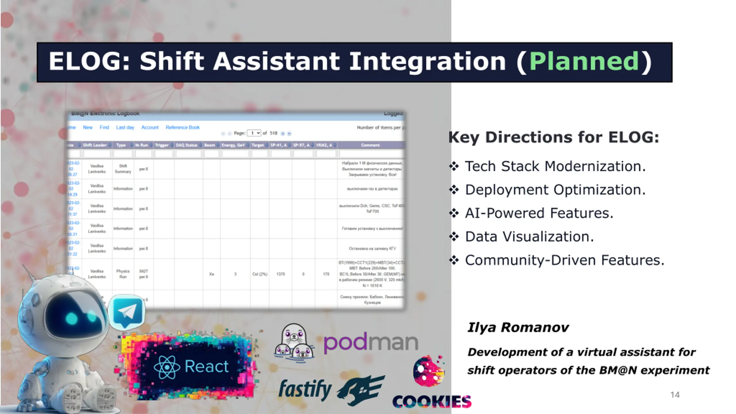 ELOG: Shift Assistant Integration (Planned) Key Directions for ELOG: Tech Stack Modernization. Deployment Optimization. AI-Powered Features. Data Visualization. Community-Driven Features. Ilya Romanov Development of a virtual assistant for shift operators of the BM@N experiment 14