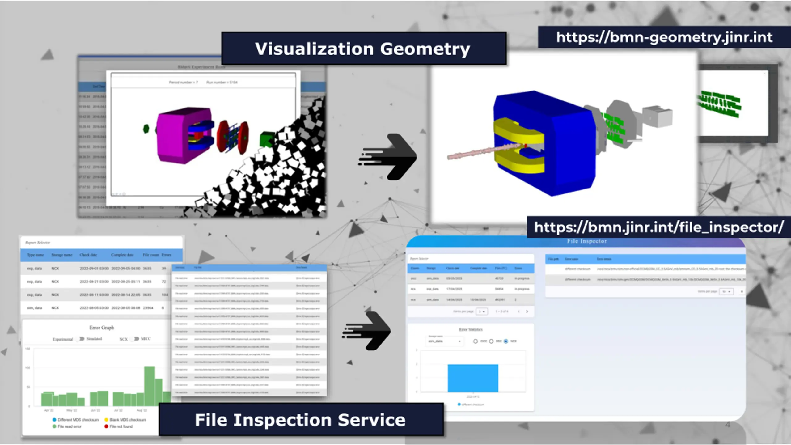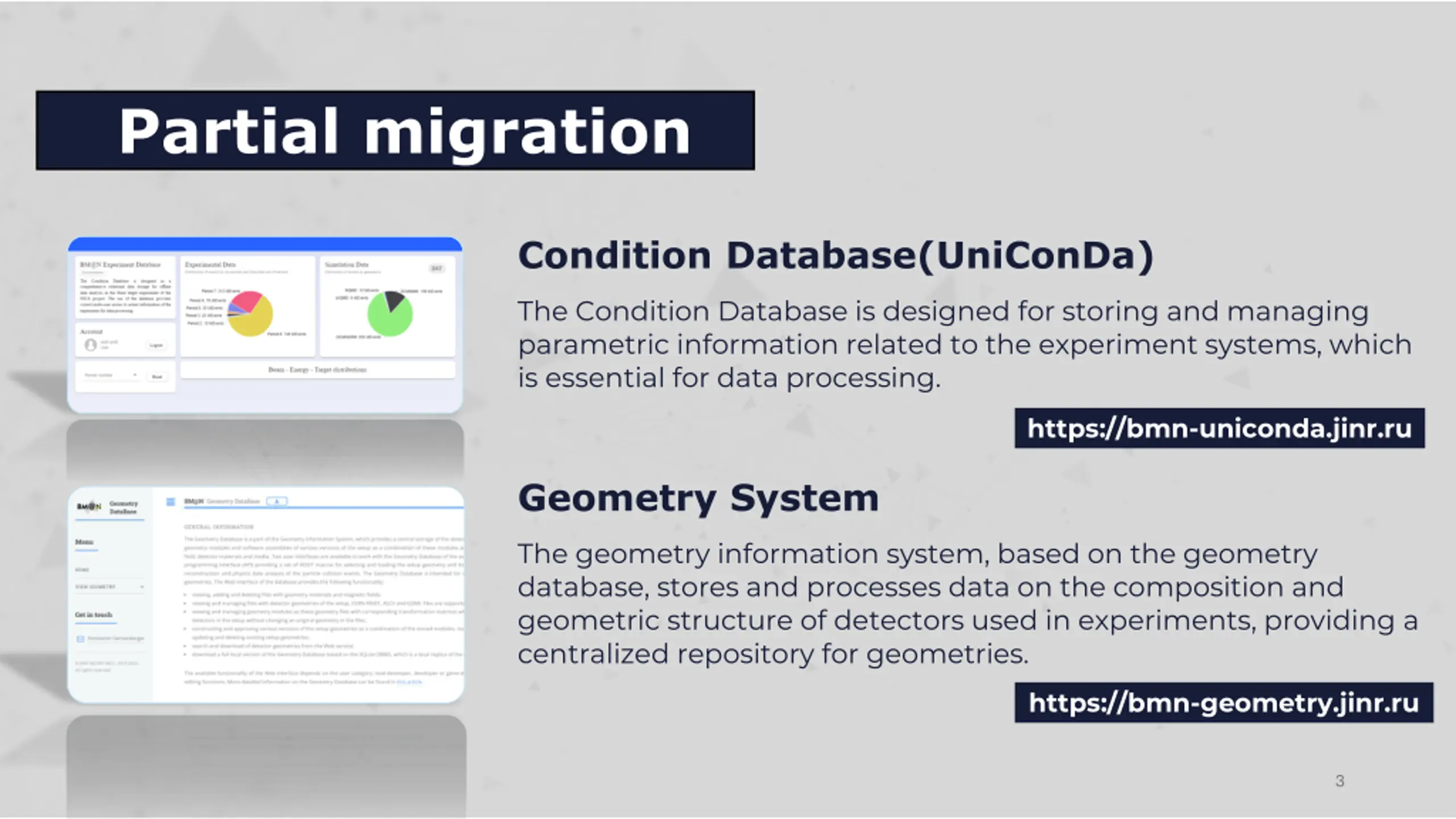Partial migration Condition Database(UniConDa) The Condition Database is designed for storing and managing parametric information related to the experiment systems, which is essential for data processing. https://bmn-uniconda.jinr.ru Geometry System The geometry information system, based on the geometry database, stores and processes data on the composition and geometric structure of detectors used in experiments, providing a centralized repository for geometries. https://bmn-geometry.jinr.ru 3