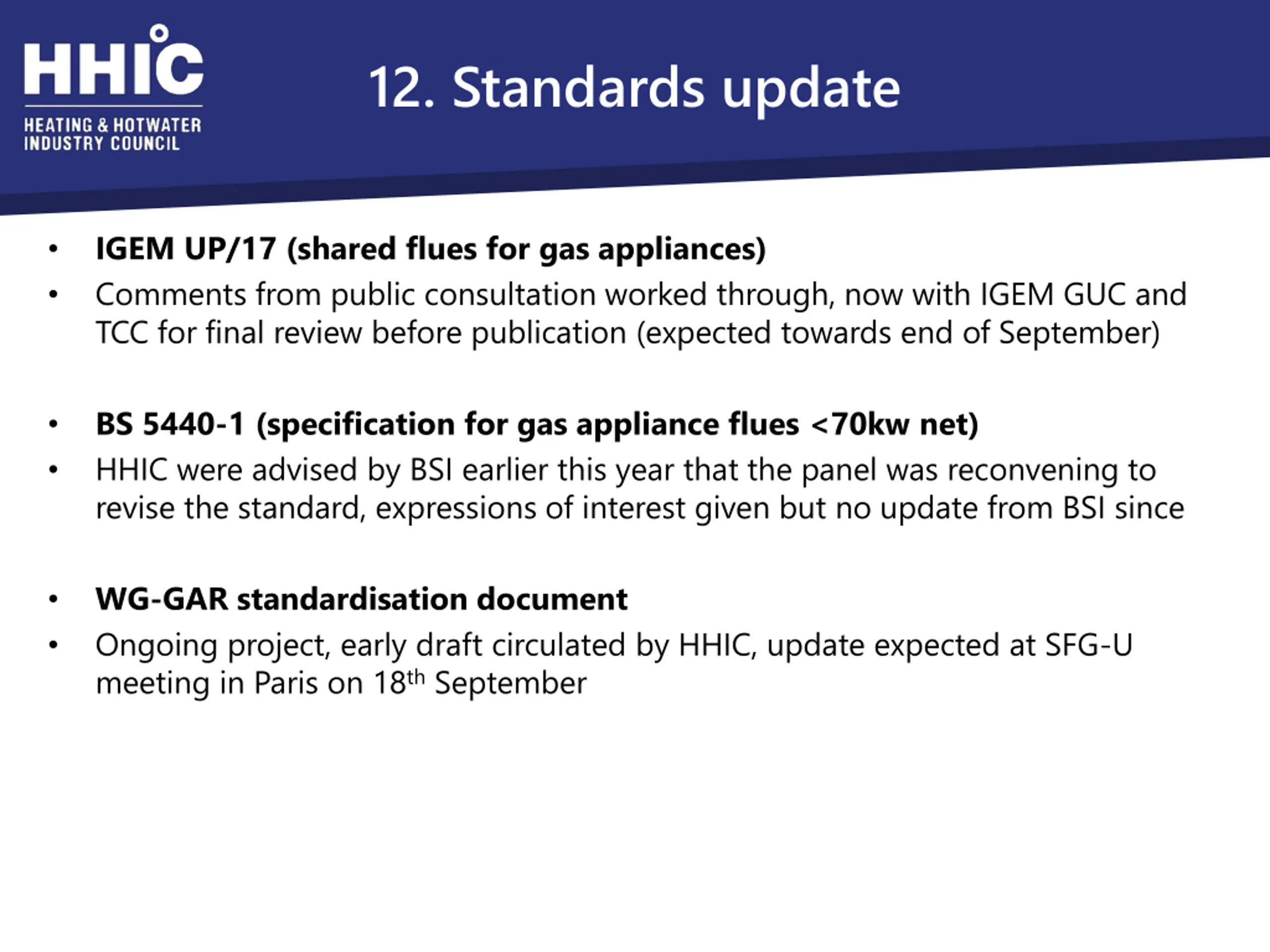 12. Standards update IGEM UP/17 (shared flues for gas appliances) Comments from public consultation worked through, now with IGEM GUC and TCC for final review before publication (expected towards end of September) BS 5440-1 (specification for gas appliance flues <70kw net) HHIC were advised by BSI earlier this year that the panel was reconvening to revise the standard, expressions of interest given but no update from BSI since WG-GAR standardisation document Ongoing project, early draft circulated by HHIC, update expected at SFG-U meeting in Paris on 18th September
