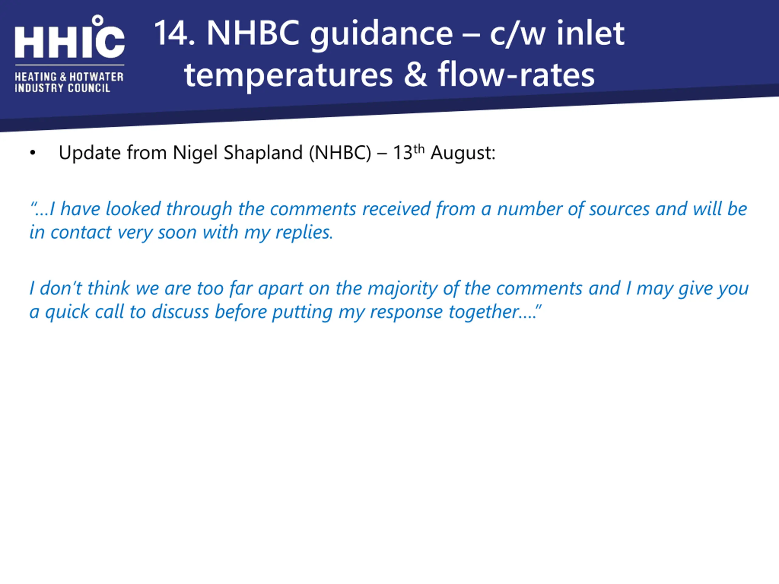 14. NHBC guidance c/w inlet temperatures & flow-rates Update from Nigel Shapland (NHBC) 13th August: I have looked through the comments received from a number of sources and will be in contact very soon with my replies. I don t think we are too far apart on the majority of the comments and I may give you a quick call to discuss before putting my response together .