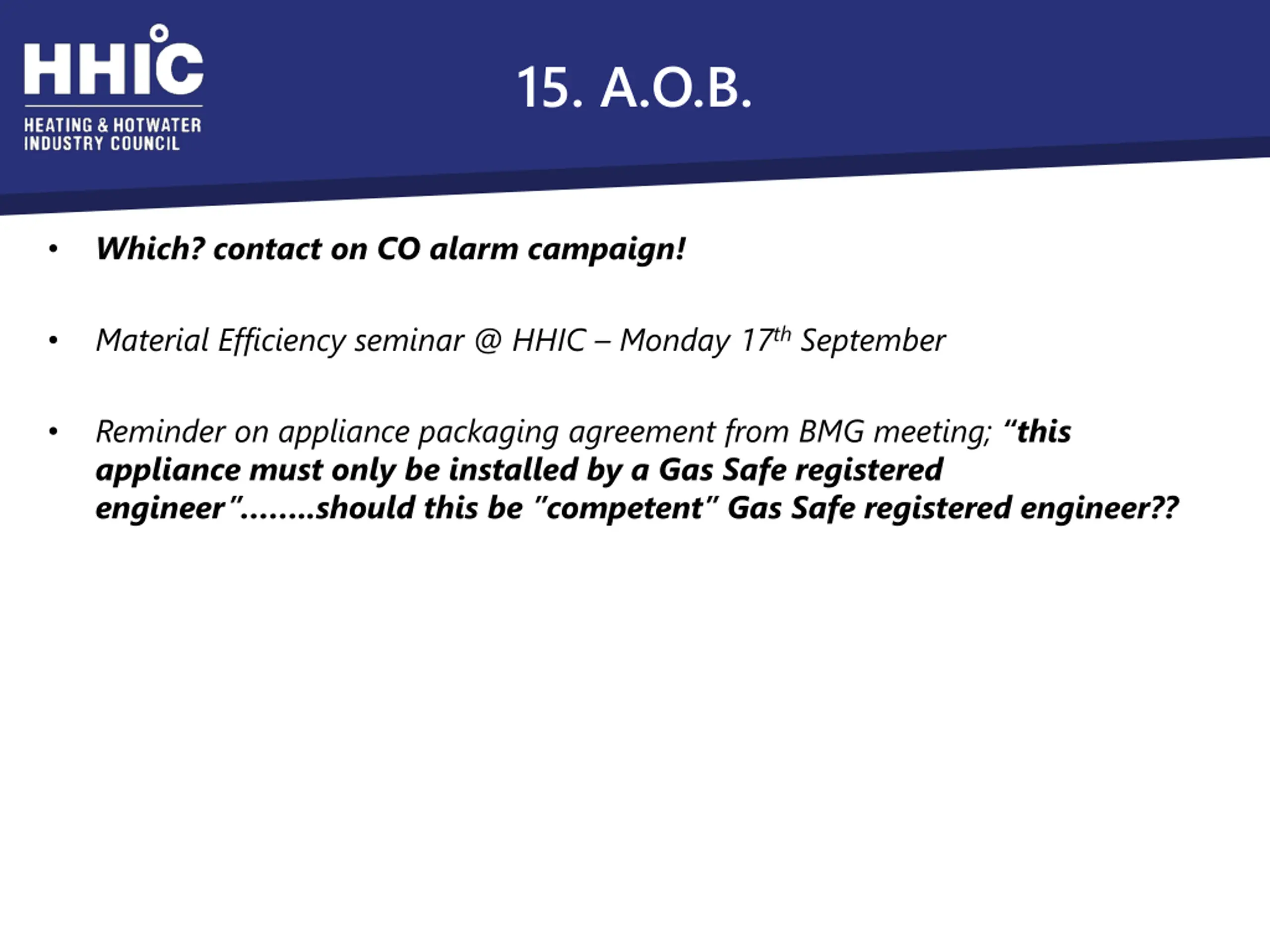 15. A.O.B. Which? contact on CO alarm campaign! Material Efficiency seminar @ HHIC Monday 17th September Reminder on appliance packaging agreement from BMG meeting; this appliance must only be installed by a Gas Safe registered engineer ..should this be competent Gas Safe registered engineer??
