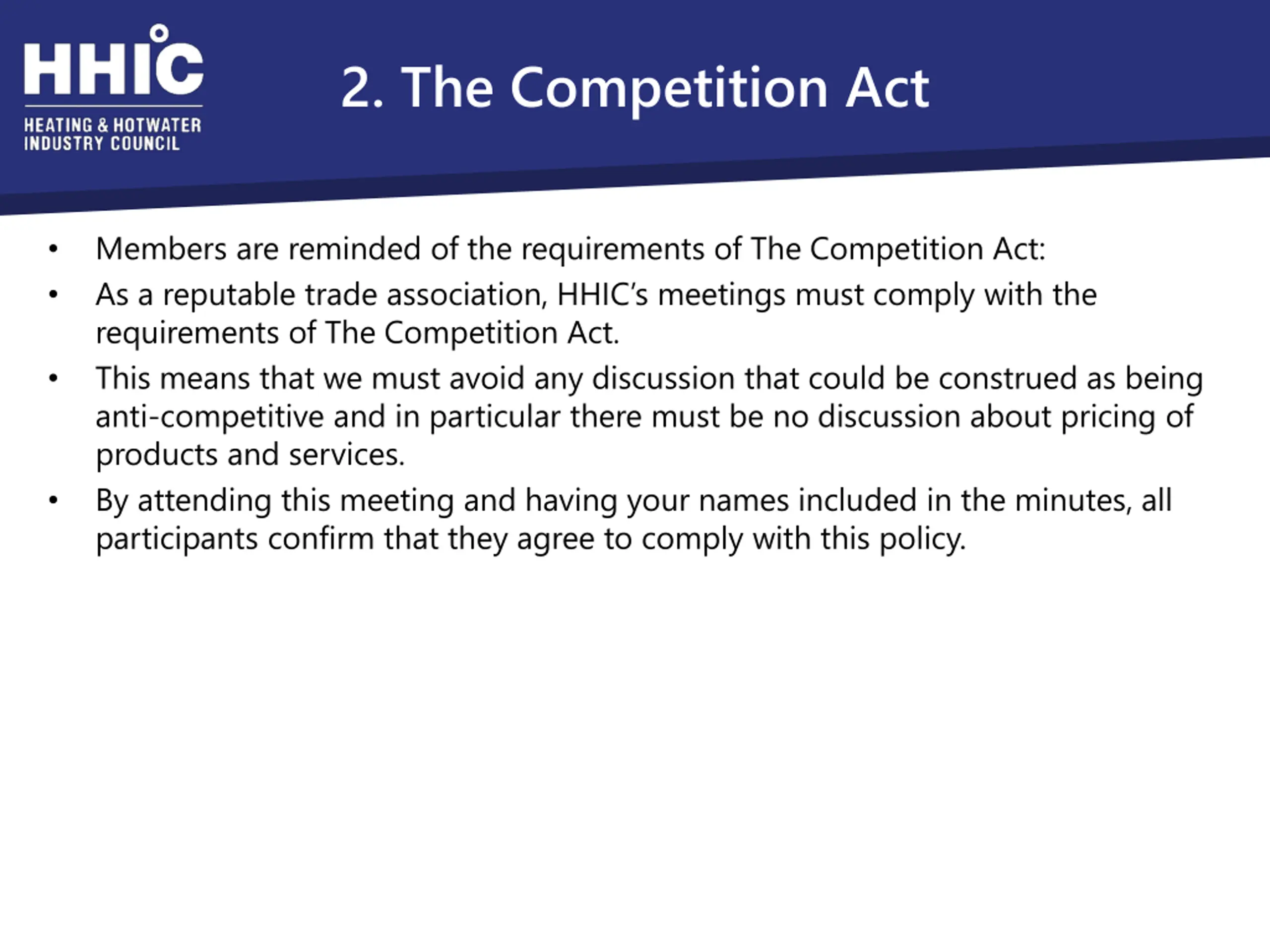 2. The Competition Act Members are reminded of the requirements of The Competition Act: As a reputable trade association, HHIC s meetings must comply with the requirements of The Competition Act. This means that we must avoid any discussion that could be construed as being anti-competitive and in particular there must be no discussion about pricing of products and services. By attending this meeting and having your names included in the minutes, all participants confirm that they agree to comply with this policy.