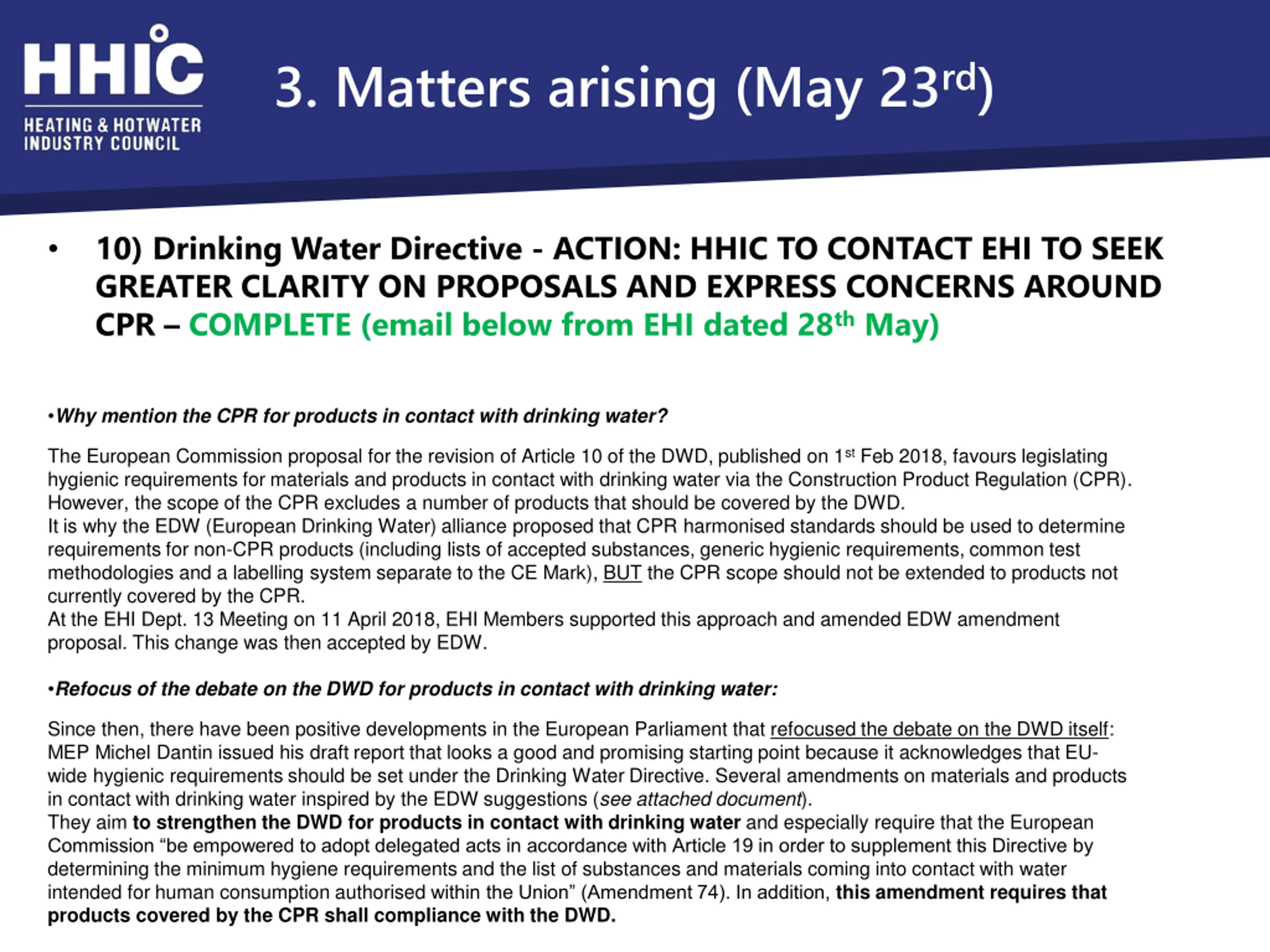 3. Matters arising (May 23rd) 10) Drinking Water Directive - ACTION: HHIC TO CONTACT EHI TO SEEK GREATER CLARITY ON PROPOSALS AND EXPRESS CONCERNS AROUND CPR COMPLETE (email below from EHI dated 28thMay) Why mention the CPR for products in contact with drinking water? The European Commission proposal for the revision of Article 10 of the DWD, published on 1st Feb 2018, favours legislating hygienic requirements for materials and products in contact with drinking water via the Construction Product Regulation (CPR). However, the scope of the CPR excludes a number of products that should be covered by the DWD. It is why the EDW (European Drinking Water) alliance proposed that CPR harmonised standards should be used to determine requirements for non-CPR products (including lists of accepted substances, generic hygienic requirements, common test methodologies and a labelling system separate to the CE Mark), BUT the CPR scope should not be extended to products not currently covered by the CPR. At the EHI Dept. 13 Meeting on 11 April 2018, EHI Members supported this approach and amended EDW amendment proposal. This change was then accepted by EDW. Refocus of the debate on the DWD for products in contact with drinking water: Since then, there have been positive developments in the European Parliament that refocused the debate on the DWD itself: MEP Michel Dantin issued his draft report that looks a good and promising starting point because it acknowledges that EU- wide hygienic requirements should be set under the Drinking Water Directive. Several amendments on materials and products in contact with drinking water inspired by the EDW suggestions (see attached document). They aim to strengthen the DWD for products in contact with drinking water and especially require that the European Commission be empowered to adopt delegated acts in accordance with Article 19 in order to supplement this Directive by determining the minimum hygiene requirements and the list of substances and materials coming into contact with water intended for human consumption authorised within the Union (Amendment 74). In addition, this amendment requires that products covered by the CPR shall compliance with the DWD.