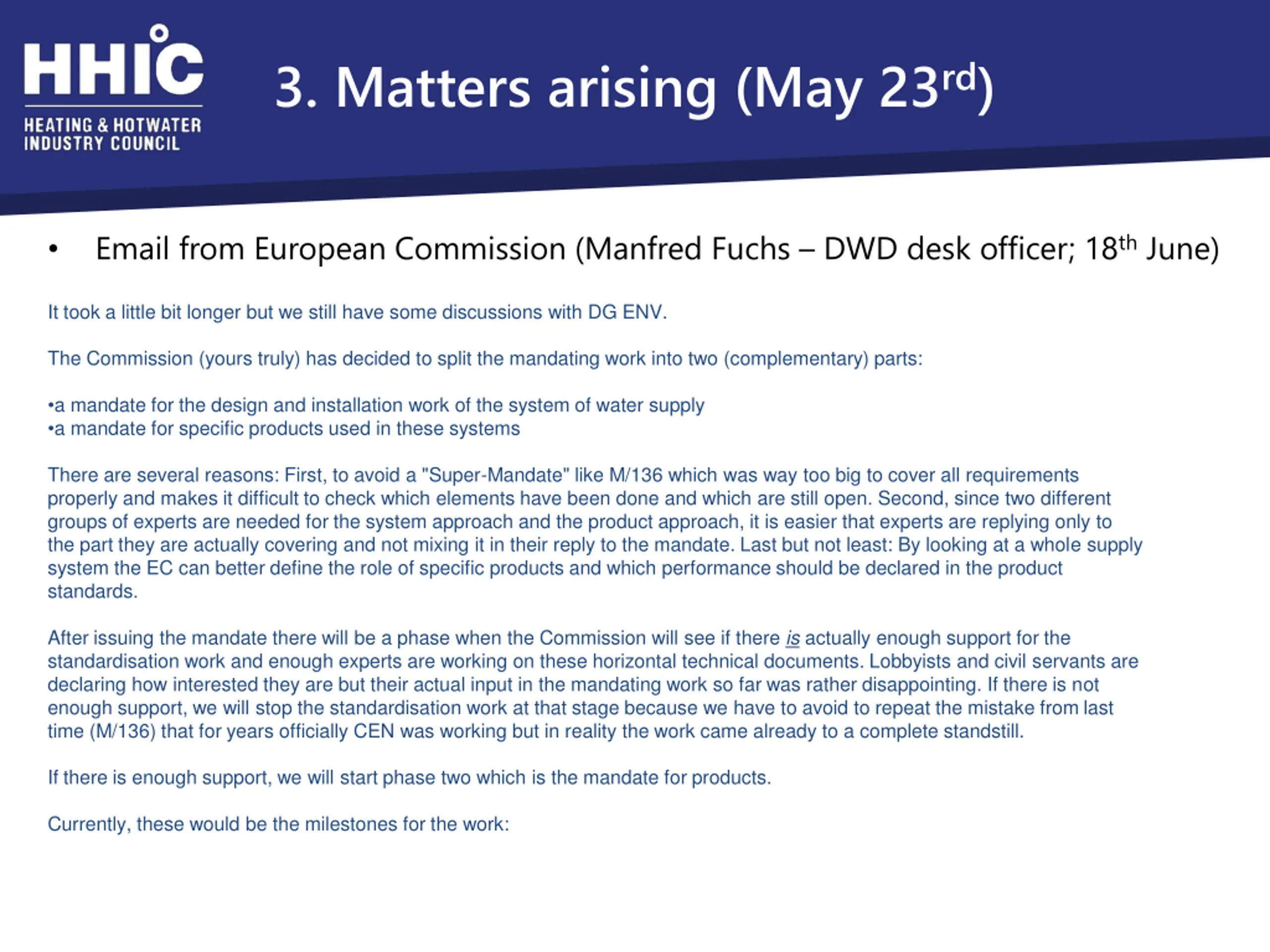 3. Matters arising (May 23rd) Email from European Commission (Manfred Fuchs DWD desk officer; 18th June) It took a little bit longer but we still have some discussions with DG ENV. The Commission (yours truly) has decided to split the mandating work into two (complementary) parts: a mandate for the design and installation work of the system of water supply a mandate for specific products used in these systems There are several reasons: First, to avoid a "Super-Mandate" like M/136 which was way too big to cover all requirements properly and makes it difficult to check which elements have been done and which are still open. Second, since two different groups of experts are needed for the system approach and the product approach, it is easier that experts are replying only to the part they are actually covering and not mixing it in their reply to the mandate. Last but not least: By looking at a whole supply system the EC can better define the role of specific products and which performance should be declared in the product standards. After issuing the mandate there will be a phase when the Commission will see if there is actually enough support for the standardisation work and enough experts are working on these horizontal technical documents. Lobbyists and civil servants are declaring how interested they are but their actual input in the mandating work so far was rather disappointing. If there is not enough support, we will stop the standardisation work at that stage because we have to avoid to repeat the mistake from last time (M/136) that for years officially CEN was working but in reality the work came already to a complete standstill. If there is enough support, we will start phase two which is the mandate for products. Currently, these would be the milestones for the work: