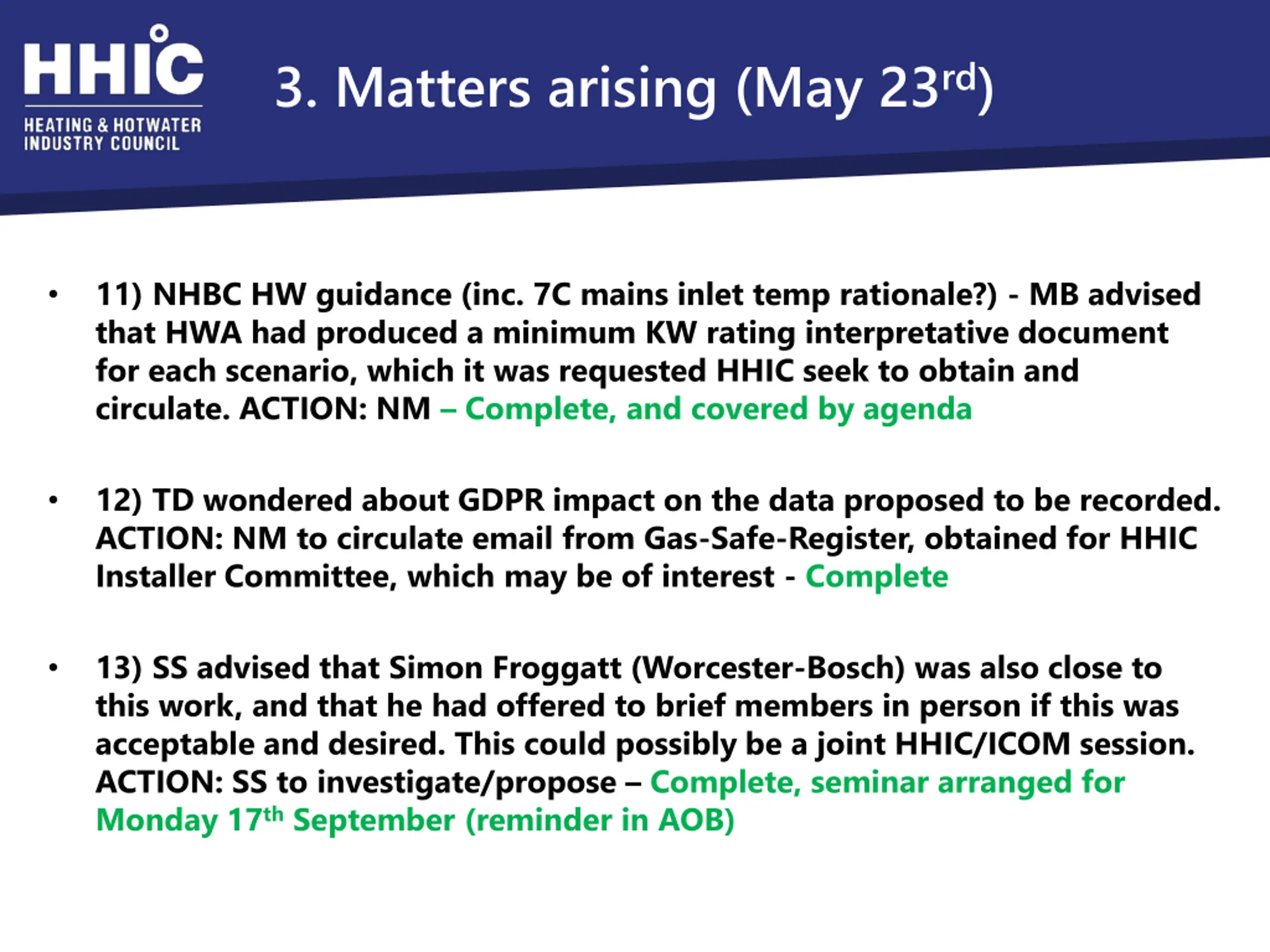 3. Matters arising (May 23rd) 11) NHBC HW guidance (inc. 7C mains inlet temp rationale?) - MB advised that HWA had produced a minimum KW rating interpretative document for each scenario, which it was requested HHIC seek to obtain and circulate. ACTION: NM Complete, and covered by agenda 12) TD wondered about GDPR impact on the data proposed to be recorded. ACTION: NM to circulate email from Gas-Safe-Register, obtained for HHIC Installer Committee, which may be of interest - Complete 13) SS advised that Simon Froggatt (Worcester-Bosch) was also close to this work, and that he had offered to brief members in person if this was acceptable and desired. This could possibly be a joint HHIC/ICOM session. ACTION: SS to investigate/propose Complete, seminar arranged for Monday 17th September (reminder in AOB)