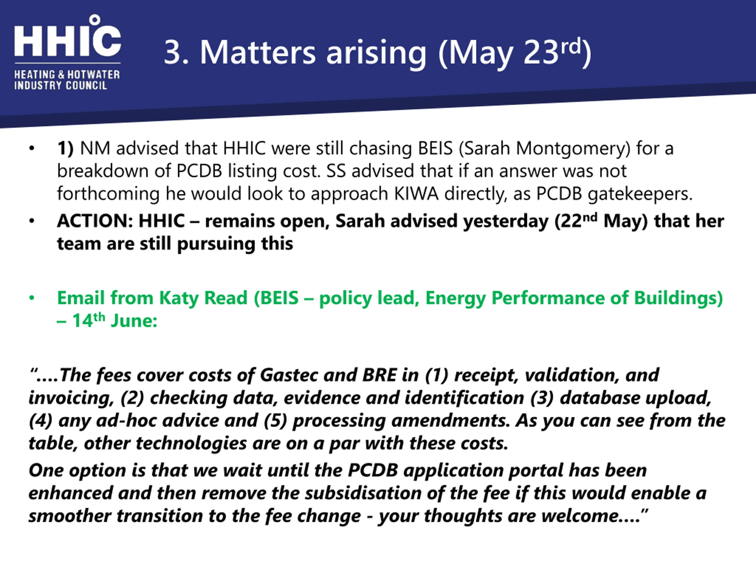 3. Matters arising (May 23rd) 1) NM advised that HHIC were still chasing BEIS (Sarah Montgomery) for a breakdown of PCDB listing cost. SS advised that if an answer was not forthcoming he would look to approach KIWA directly, as PCDB gatekeepers. ACTION: HHIC remains open, Sarah advised yesterday (22ndMay) that her team are still pursuing this Email from Katy Read (BEIS policy lead, Energy Performance of Buildings) 14thJune: .The fees cover costs of Gastec and BRE in (1) receipt, validation, and invoicing, (2) checking data, evidence and identification (3) database upload, (4) any ad-hoc advice and (5) processing amendments. As you can see from the table, other technologies are on a par with these costs. One option is that we wait until the PCDB application portal has been enhanced and then remove the subsidisation of the fee if this would enable a smoother transition to the fee change - your thoughts are welcome .