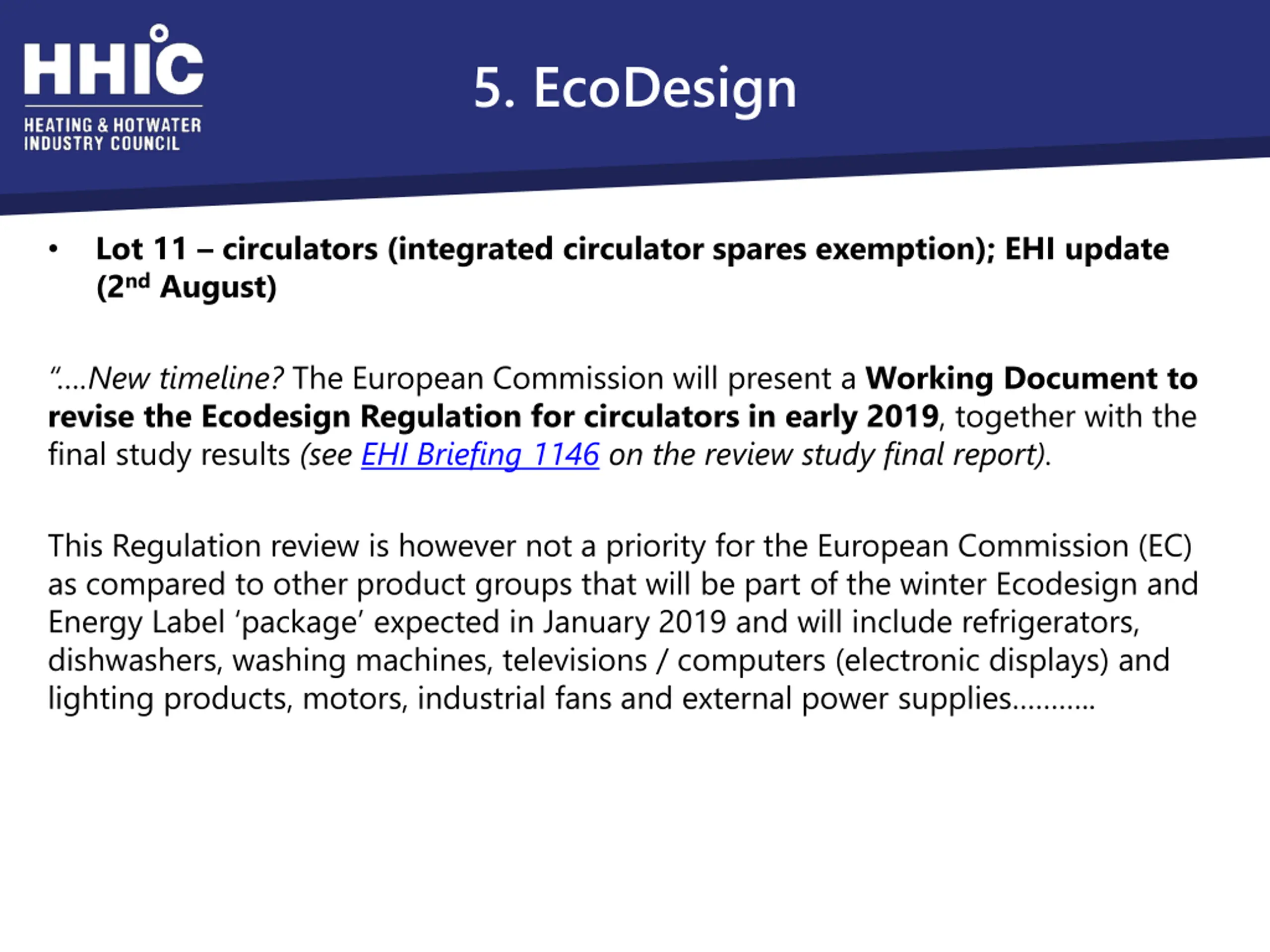 5. EcoDesign Lot 11 circulators (integrated circulator spares exemption); EHI update (2nd August) .New timeline? The European Commission will present a Working Document to revise the Ecodesign Regulation for circulators in early 2019, together with the final study results (see EHI Briefing 1146 on the review study final report). This Regulation review is however not a priority for the European Commission (EC) as compared to other product groups that will be part of the winter Ecodesign and Energy Label package expected in January 2019 and will include refrigerators, dishwashers, washing machines, televisions / computers (electronic displays) and lighting products, motors, industrial fans and external power supplies ..