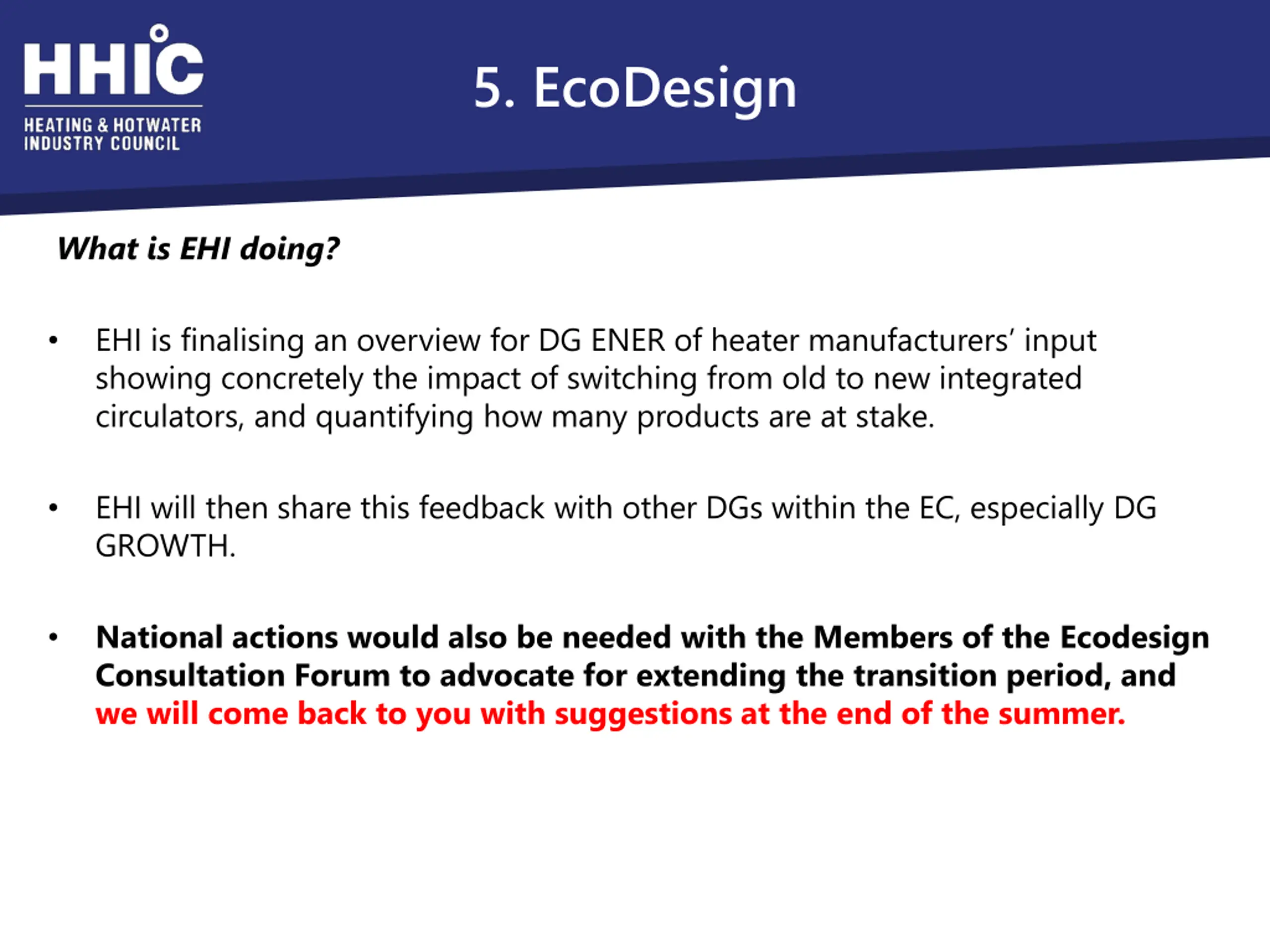 5. EcoDesign What is EHI doing? EHI is finalising an overview for DG ENER of heater manufacturers input showing concretely the impact of switching from old to new integrated circulators, and quantifying how many products are at stake. EHI will then share this feedback with other DGs within the EC, especially DG GROWTH. National actions would also be needed with the Members of the Ecodesign Consultation Forum to advocate for extending the transition period, and we will come back to you with suggestions at the end of the summer.