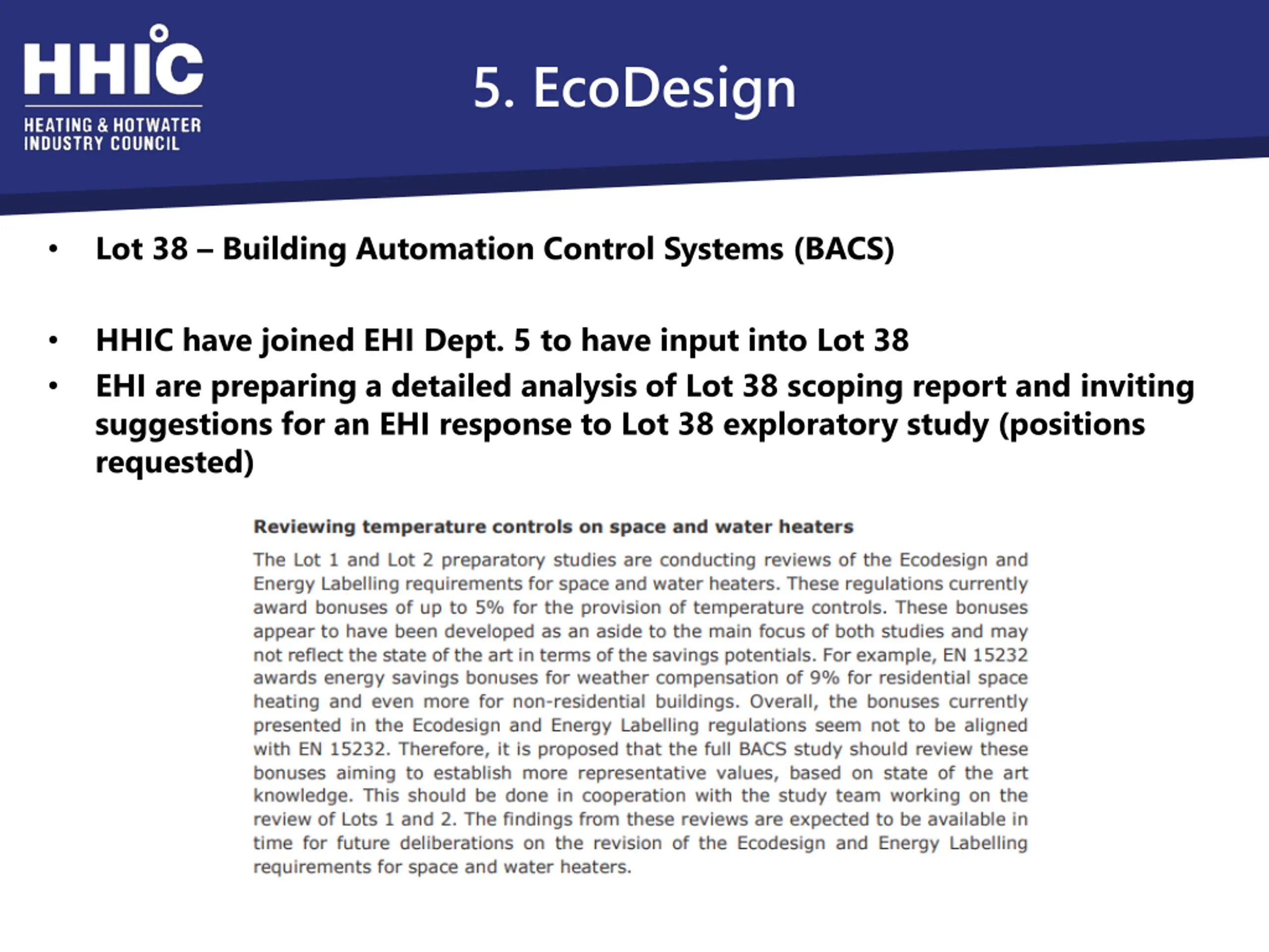 5. EcoDesign Lot 38 Building Automation Control Systems (BACS) HHIC have joined EHI Dept. 5 to have input into Lot 38 EHI are preparing a detailed analysis of Lot 38 scoping report and inviting suggestions for an EHI response to Lot 38 exploratory study (positions requested)